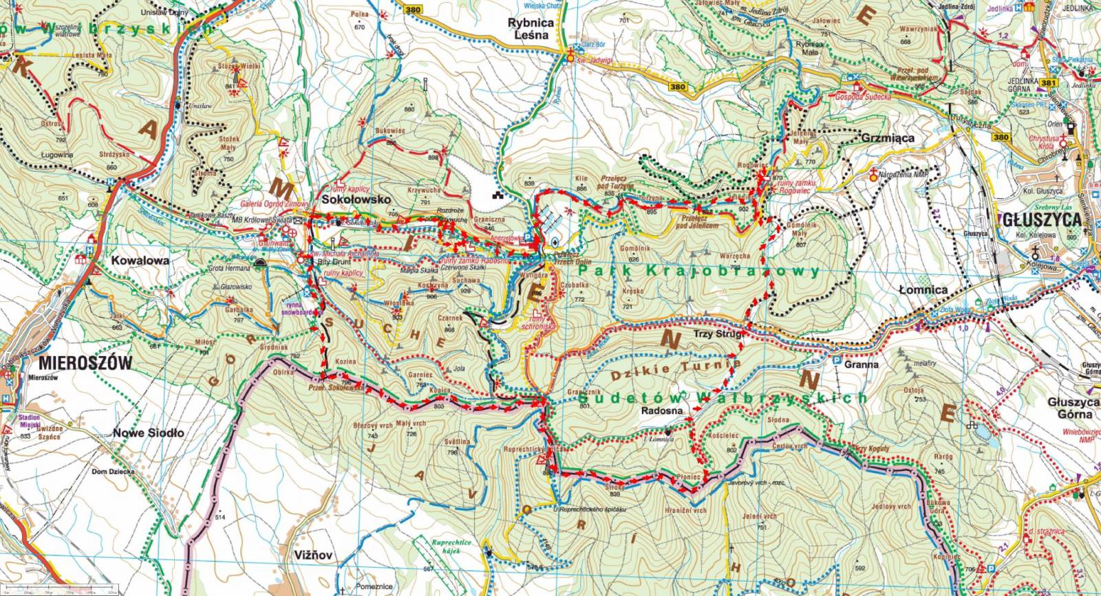 Zaktualizowana w terenie mapa turystyczna Sudetów Środkowych z wyszczególnionymi szlakami pieszymi i rowerowymi. Mapa obejmuje m.in. Góry Sowie, Góry i Pogórze Wałbrzyskie, Góry Kamienne oraz dużą część Broumovskiej Vrchoviny ze skalnymi miastami Aderszpasko Teplickich Skał włącznie. Na mapie uwzględniono atrakcje turystyczne oraz informacje praktyczne. Rok wydania 2020
