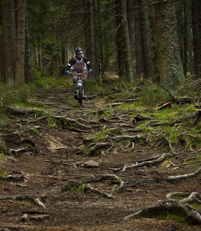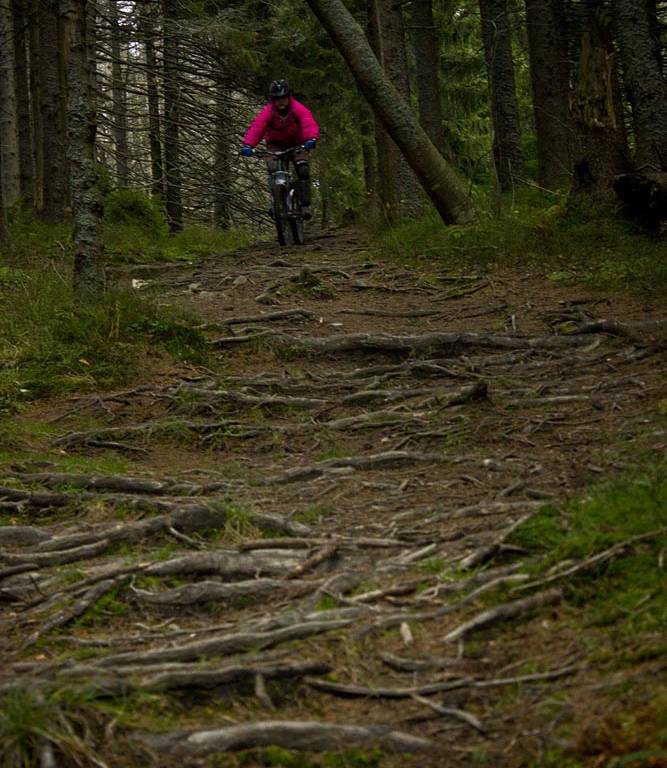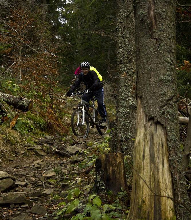 Jazdę rozpoczynamy w Ochotnicy Dolnej skąd wyruszamy szlakiem zielonym prowadzącym na Gorc (naprzeciw stacji paliw). Z początku trzymamy się znaków zielonych i jedziemy dnem doliny, ale po ok. 2 km nie odbijamy z drogi głównej za szlakiem, tylko trzymamy się cały czas asfaltu i dojeżdżamy do jego końca. Następnie bardzo stromym podejściem wynosimy rower na leśną ścieżkę, która wyprowadzi nas na sarkaj polany (ścieżka miejscami jest również bardzo stroma, ale omijamy w ten sposób jesienne masy błota zalegające na drodze zrywkowej). Ze skraju polany, gdzie ścieżka zanika, zjeżdżamy kilkadziesiąt metrów w dół i dojeżdżamy do drogi stokowej, która doprowadzi nas do szlaku zielonego prowadzącego na Gorc. Cały ten odcinek jest bardzo trudny (stromy) i na większości jego dystansu trzeba rower pchać. Prawdopodobnie wariant podjazdu od samego początku szlakiem zielonym będzie nieco lepszy. Jazda grzbietem z Gorca w stronę Jaworzyny Kamienickiej jest urodziwa. Szlak miejscami przybiera formę singla, nie brakuje korzeni i ścianek z luźnymi kamieniami. Z jaworzyny Kamienickiej przemieszczamy się dalej na Kiczorę skąd zjeżdżamy szlakiem czerwonym na Przełęcz Knurowską. Następie z przełęczy możemy zjechać do Ochotnicy drogą asfaltową (nuda, wybraliśmy ten wariant ze względu na defekty sprzętowe) lub pojechać dalej w stronę Lubania.