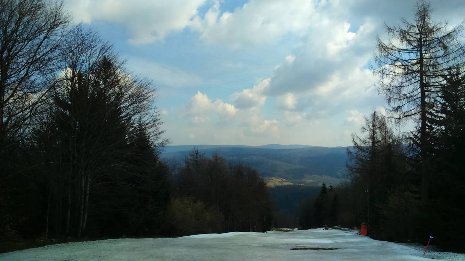 Szlakiem niebieskim. Łagodne podejście. Po drodze schronisko turystyczne i stok narciarski - jedyny punkt widokowy :)