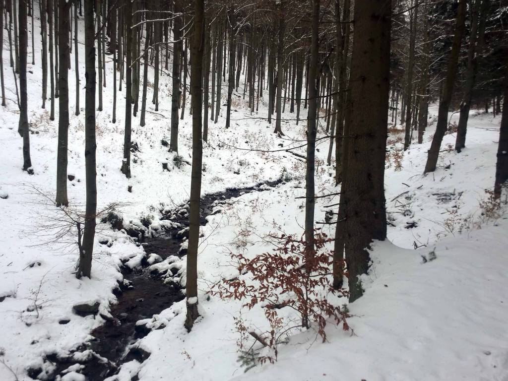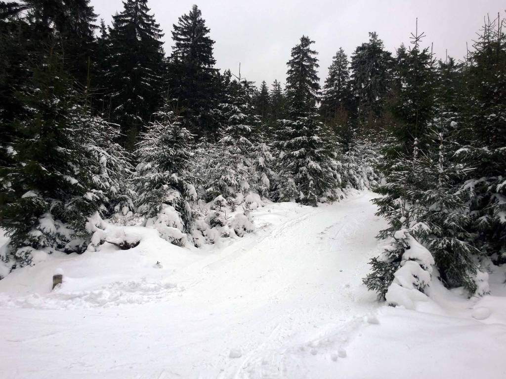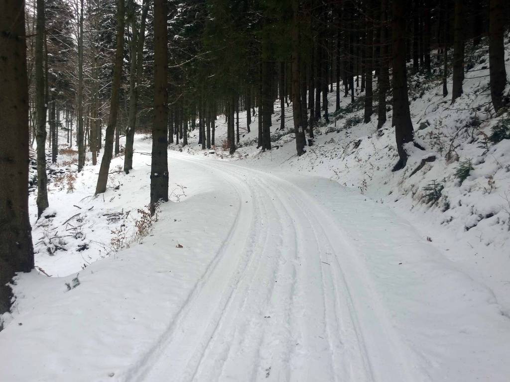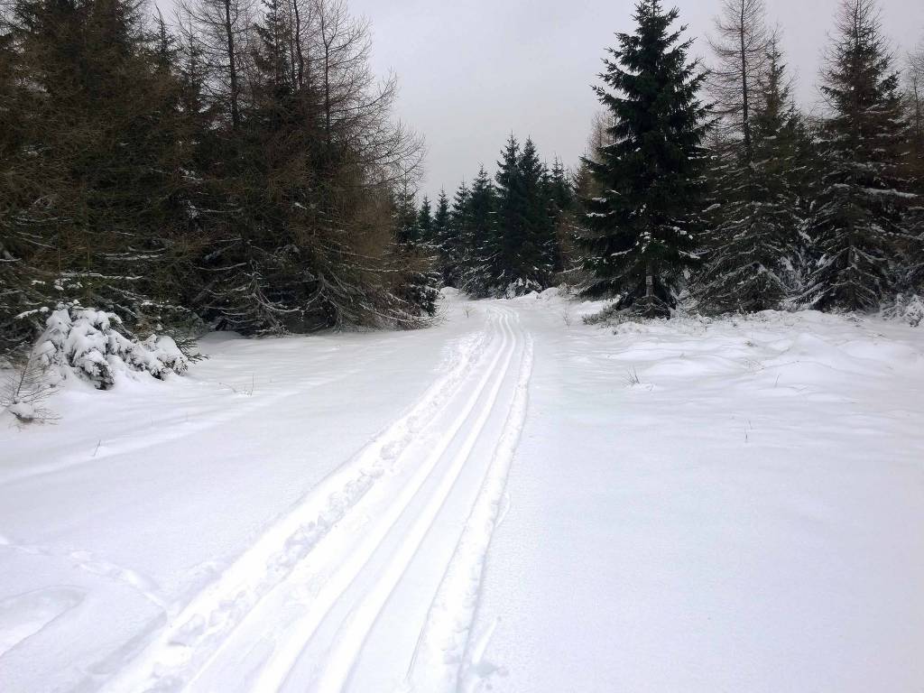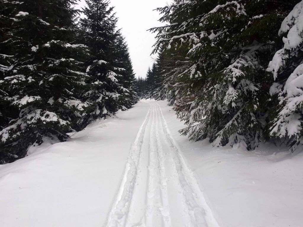 Dziś zaczynam od parkingu w Nowej Morawie. Tym razem parkingi przygotowane i spokojnie można zaparkować. Trasa jest trudna, bo to ponad 3 km biegu pod dość stromą górę, aż do Suchej Przełęczy. Pomimo ,e przejechał tam skuter śnieżny, to ślad słaby, bo ktoś wcześniej go zadeptał. Dobrze jest dopiero od przełęczy aż do połączenia z Szengenem, gdzie trasy są już ratrakowane.