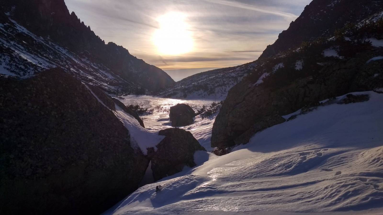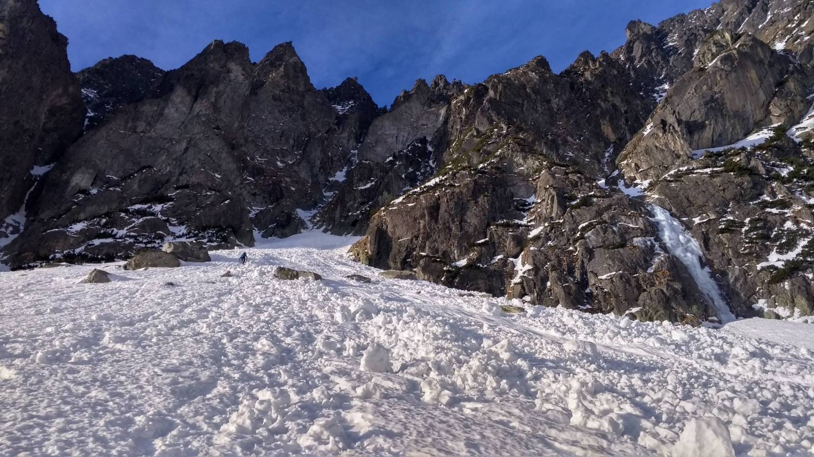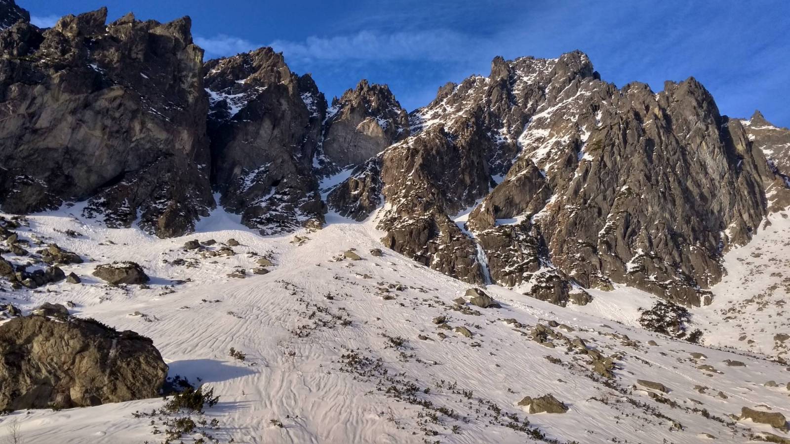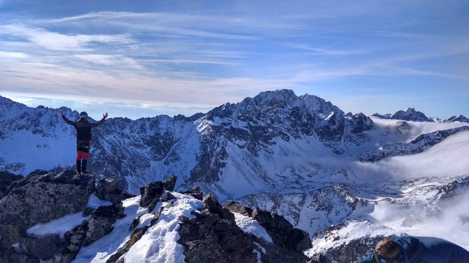 Nareszcie zrobiły się dobre warunki do zimowej turystyki. Celem tej zimy jest zdobywanie kolejnych szczytów Wielkiej Korony Tatr. Tym razem padło na Pośrednią Grań. Start oczywiście w Starym Smokovcu i podejście najpierw na Hrebieniok a potem do Chaty Zamkowskiego gdzie posilamy się przed akcją. Dalej idziemy w stronę Teryho by przed podejściem odbić w stronę żlebu Stilla. Tam na początek próg, który niestety nie był przysypany śniegiem i trzeba było trochę kombinować aby go przekroczyć. Potem pozostało podejście długim żlebem. W końcu docieramy na przełączkę i otwiera się widok na dolinę Staroleśną i Staroleśny Szczyt. Wyszliśmy też w Słońce, które tego dnia mocno grzało i utrudniało ostatnie podejście na szczyt. Ale w końcu się udało i na górze czekała piękna panorama. Przez główną grań zaczęły przelewać się chmury co dodało ciekawego elementu do krajobrazu. Widoki i pogoda piękne ale czas schodzić. Zejście tą samą drogą z tym że z progu zjechaliśmy na linie. Potem pozostało zejście do doliny i dalej do auta. Wycieczka udana, szczyt WKT zdobyty.