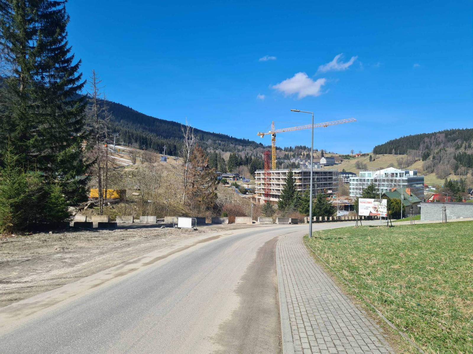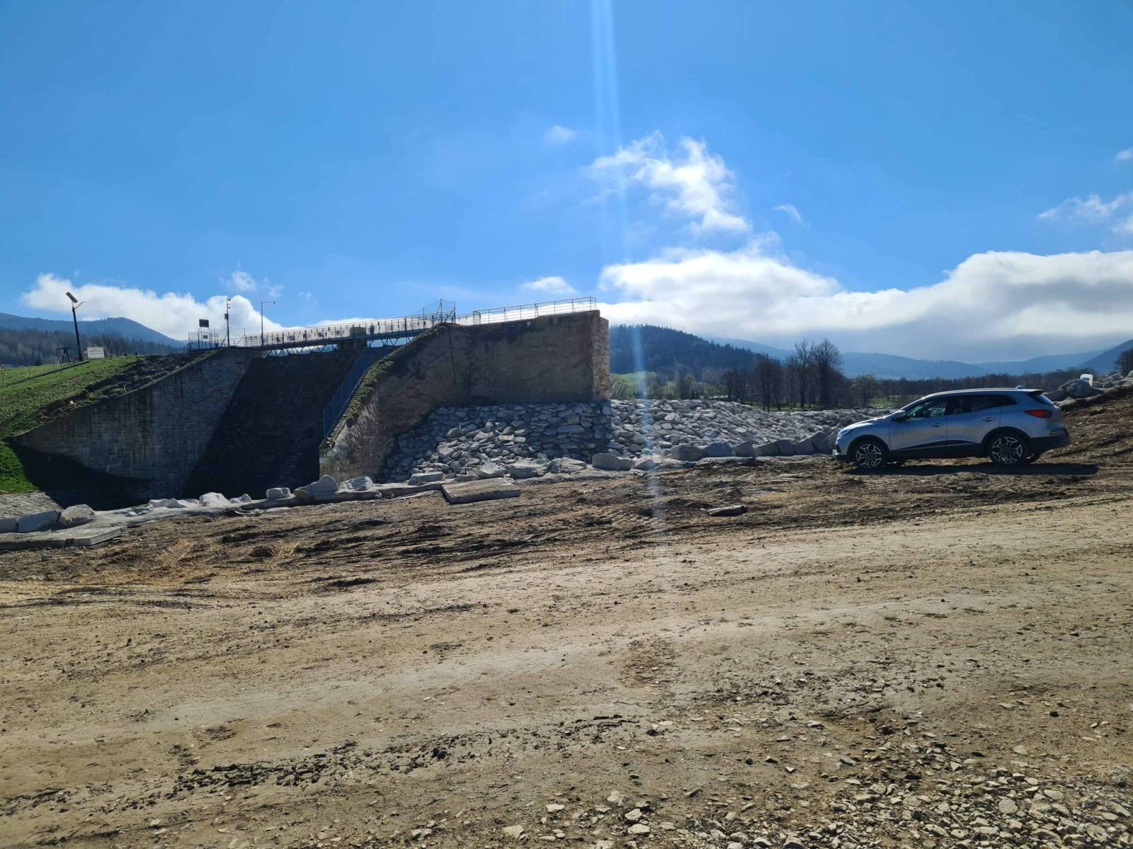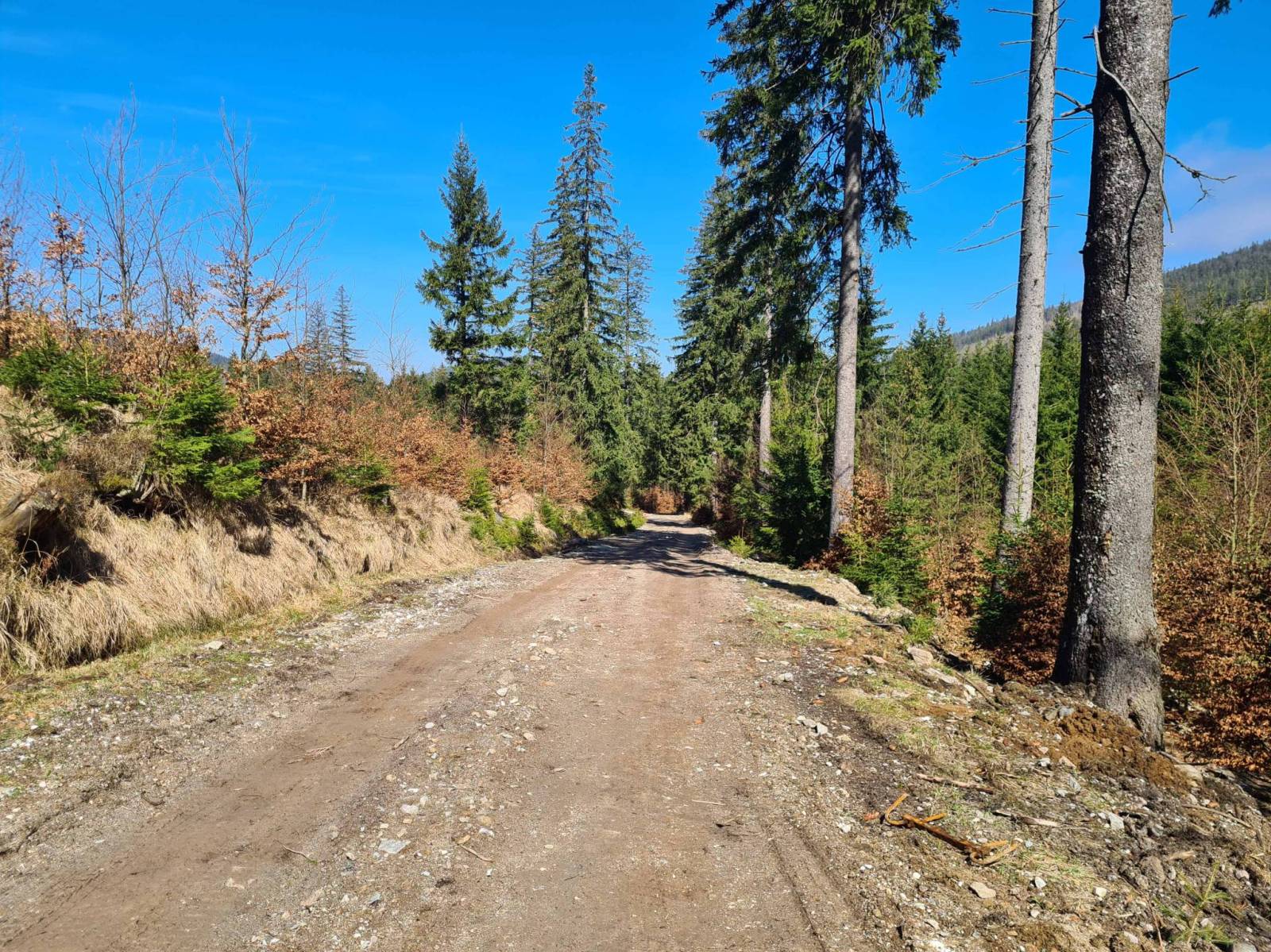 Po wczorajszym deszczu wstał ciepły można powiedzieć upalny dzień . Gdyby nie wiatr to pewnie ciężko było by wytrzymać , a to przecież połowa kwietnia . Ruszam w stronę Kamienicy . Po drodze zaglądam na będący w budowie park w Stroniu Śląskim . Widać tu jeszcze szkody po powodzi . Trwają jakieś prace wokół zniszczonej i częściowo odbudowanej tamy. W Kamienicy ciągle widoczne ślady po powodzi . Ruszam w las w kierunku Kletna . Widać ,że leśne drogi już częściowo naprawione . Jeszcze fragment w stronę Jaksini Niedźwiedziej nie przejezdny ze względu na zwalony most , ale da się przejść przez potok.