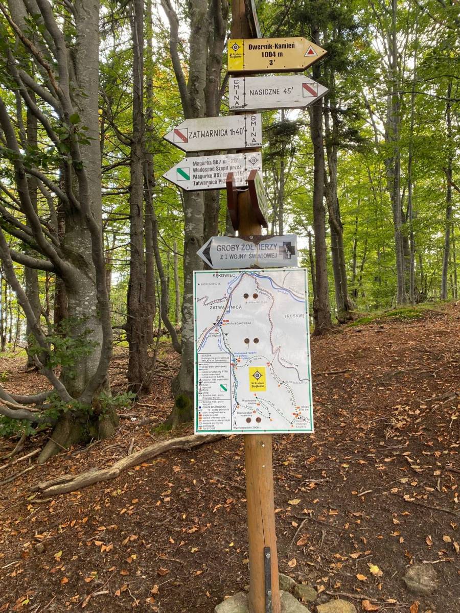 Mapa Bieszczadów w okolicach Cisnej - miejscowość jest wcentralnej części mapy. Na mapie znajdują się miejscowości: Jabłonki, Zatwarnica, Łopienka, Wetlina, Balnica. Znajdziemy tu trasy rowerowe, szlaki piesze i ścieżki przyrodniczo-edukacyjne. Podane są długości czasu przejść. Rok wydania 2022