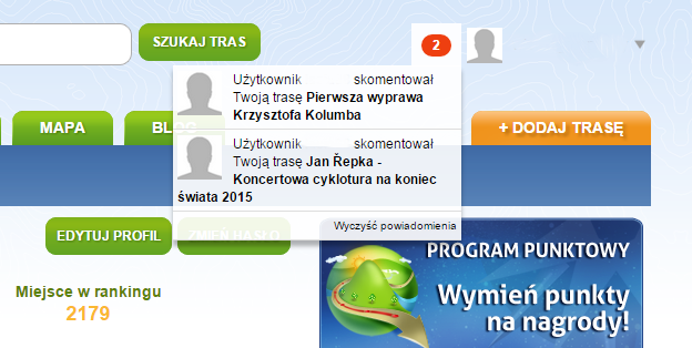 Po zalogowaniu się na swoje konto otrzymujemy powiadomienie o komentarzach – jeśli ktoś skomentował naszą trasę, obok loginu pojawia się czerwone powiadomienie – podobnie jak na dobrze znanym portalu społecznościowym ;) po kliknięciu na nie zostaniemy przeniesieni do danej trasy i wypowiedzi.