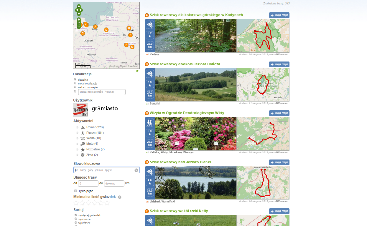 Będąc zalogowanym mamy możliwość filtrowania własnych tras – interfejs jest analogiczny jak przy zwykłym wyszukiwaniu tras: dzięki temu możemy w łatwy sposób wyszukać nasze trasy według kategorii, długości, regionu itp. Bardzo fajnie prezentują się one na mapie, dzięki czemu możemy zobaczyć, który region jest przez nas najmocniej eksploatowany ;)