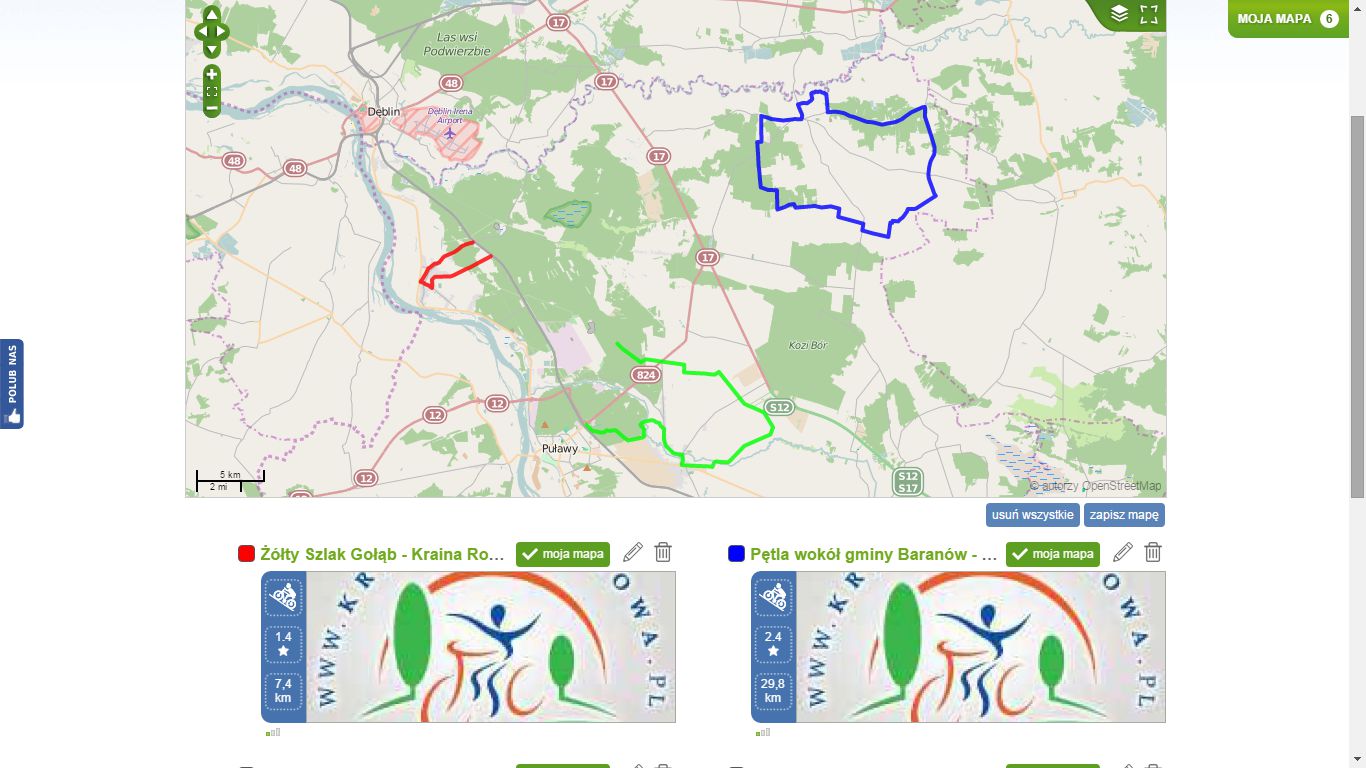 Jak zapewne zauważyliście nad każdą trasą znajduje się przycisk „+Moja mapa”, dzięki któremu można dodać poszczególne trasy do jednej, zbiorczej mapy, później ją zapisać lub udostępnić na swojej stronie www jako wlepkę – po kliknięciu „zapisz”, wpisaniu nazwy, pojawia się przycisk „umieść na stronie”, który generuje gotowy kod html.