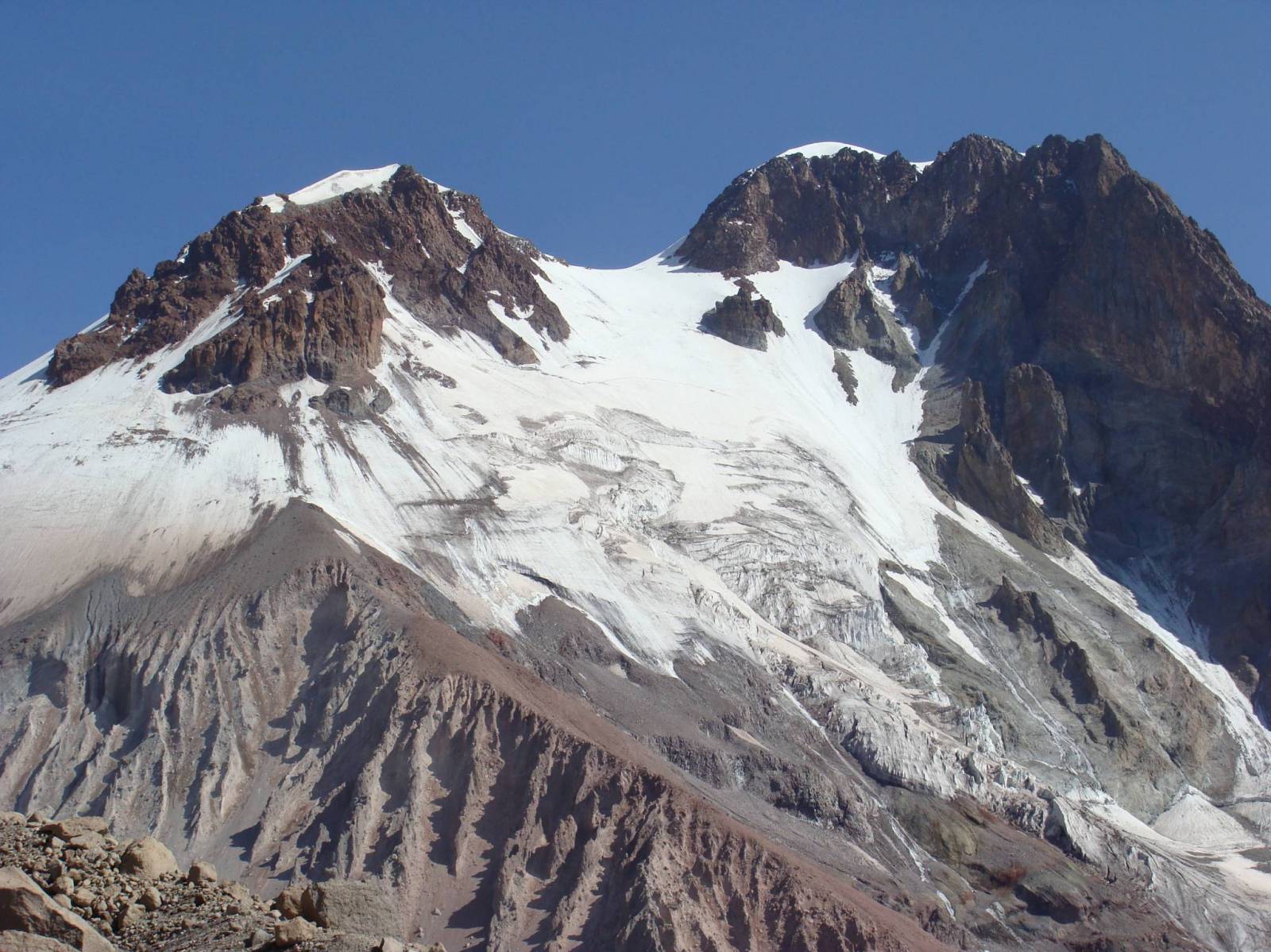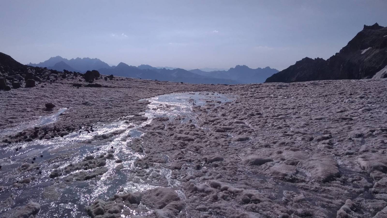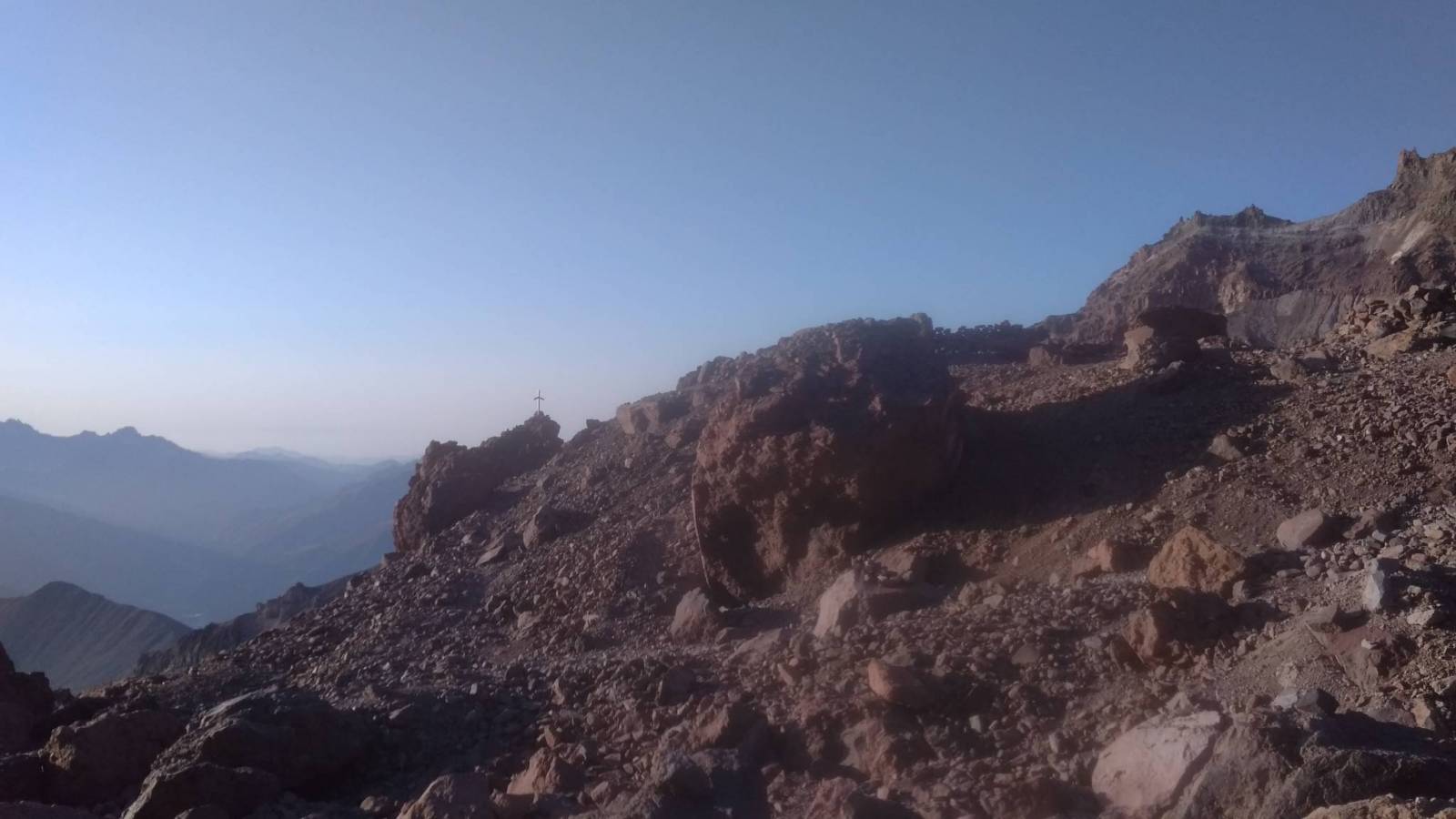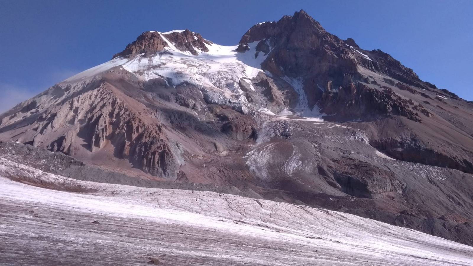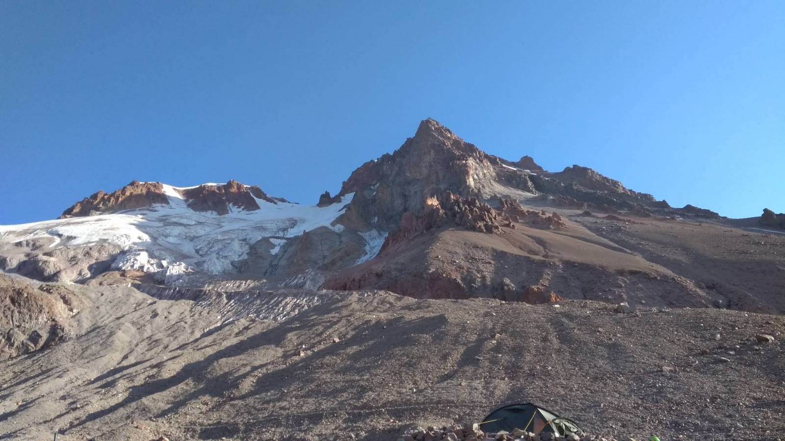 Długie przygotowania w końcu zostały wynagrodzone. Jesteśmy na Kaukazie i już za jeden dzień staniemy powyżej 5000m, ale najpierw aklimatyzacja. Poprzedniego dnia, dzieląc na dwie części (najpierw trekking nocny na 3000, potem na ponad 3600) wyjście do Meteo, bazy wypadowej na Kazbek. Start tuż przed wschodem Słońca. Idziemy wyraźną ścieżką po drodze mijając biały krzyż, a następnie czarny. Za drugim krzyżem jeszcze chwilę idziemy po gruzie i w końcu docieramy do lodowca. Na nim ubieramy sprzęt, wiążemy się liną i nim idziemy do góry na przełęcz pod Orstveri po drodze mijając szczeliny. Na przełęczy siadamy na ok pół godziny by zjeść zrobić zdjęcia no i przede wszystkim odbyć aklimatyzację tak ważną przy zdobywaniu szczytów powyżej 4000 metrów. Pogoda sprzyja. Czyste niebo, przejrzyste powietrze, ale czas schodzić i odpocząć przed atakiem. Powrót tą samą drogą. Tego dnia uświadomiłem sobie, że Kazbek to góra gruzu. Co chwila słychać spadające kamienie, a ścieżka jeśli prowadzi poza lodowcem to nie lite skały a piarżyska uprzykrzające wędrówkę, ale czego się nie zrobi dla 5k :D