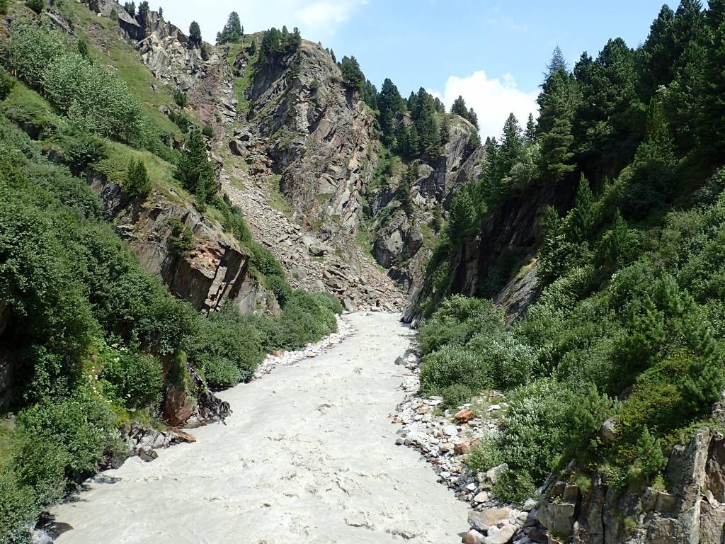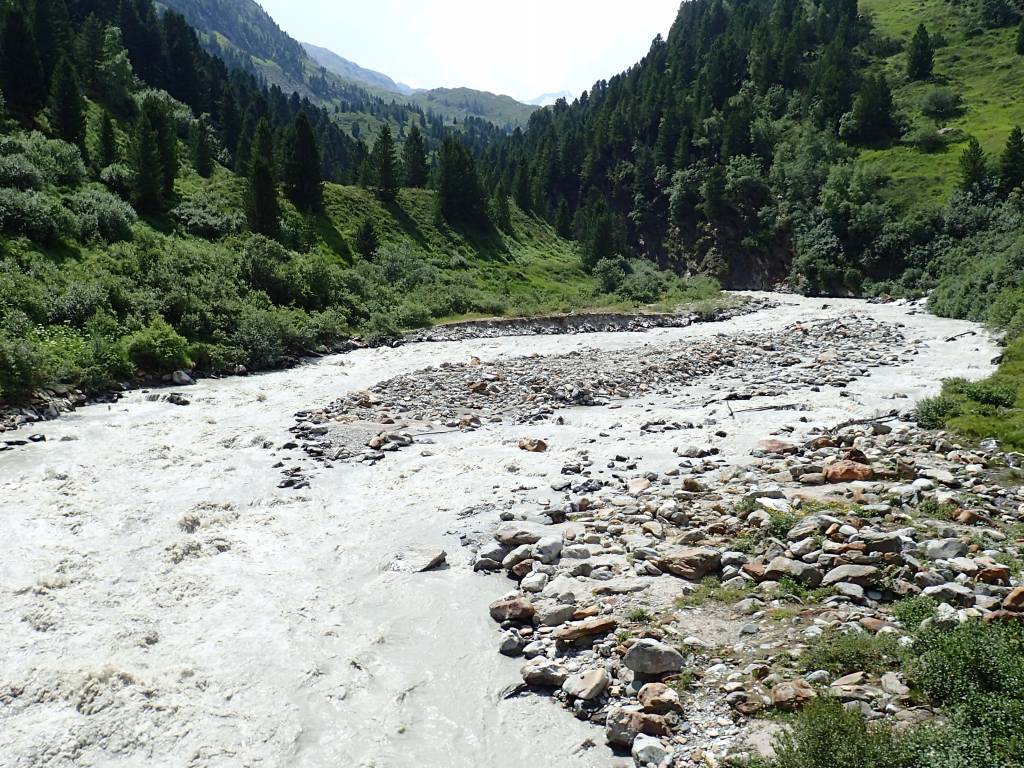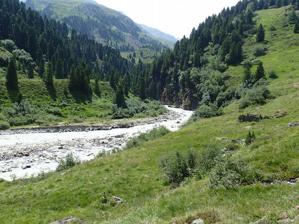 W drodze powrotnej, żeby choć trochę urozmaicić sobie monotonię szlaku, zszedłem w dół doliny i wracałem wzdłuż rzeki Gurgler Ache, przechodząc na końcu przez teren, wpisanego na listę UNESCO, parku Obergurgler Zirbenwald.