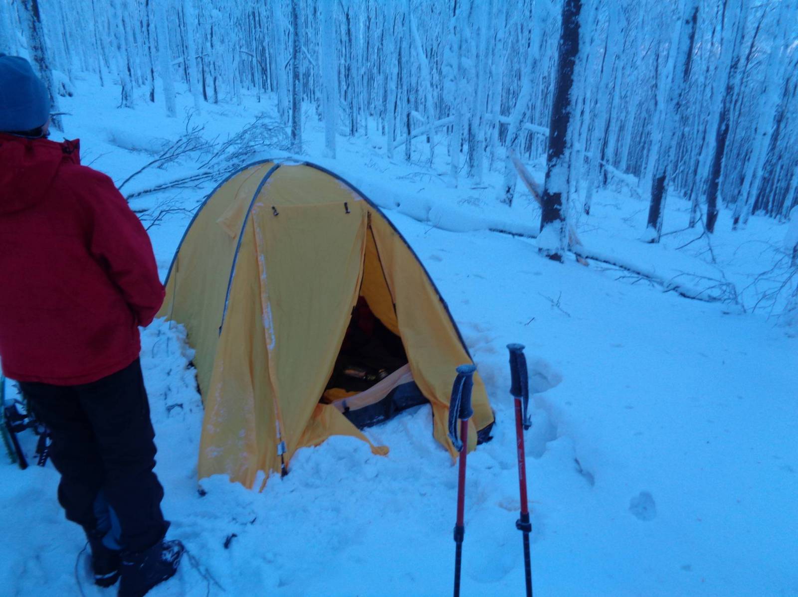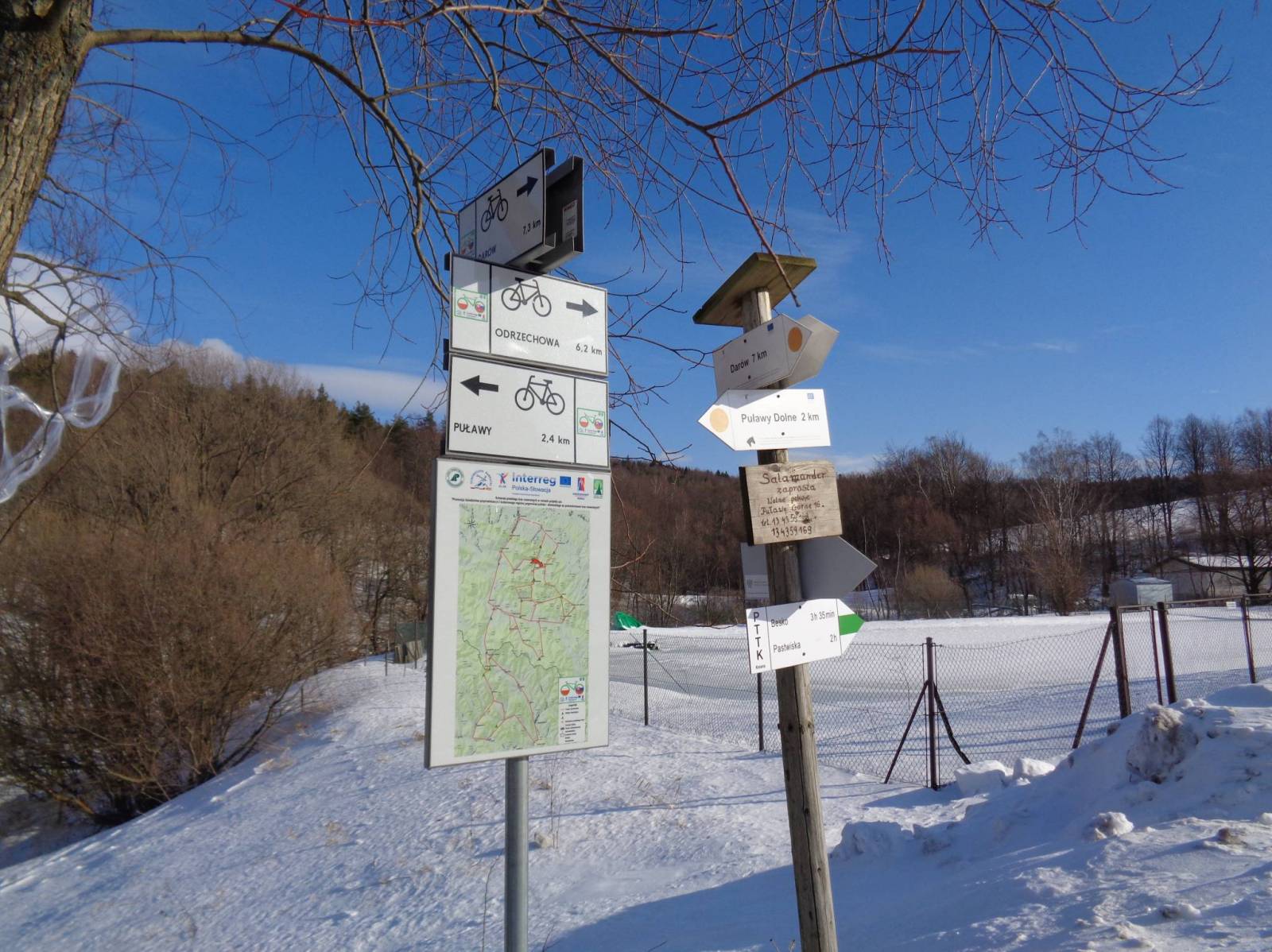 Cichy poranek wiatru niema słońce świeci, magiczna różdżka zmieniła wszystko. Robimy porządek z obozem i ruszamy dalej, jak wczoraj brniemy w nawianym śniegu i nawet rakiety niewiele dają idzie się ciężko.Ale już po paru kilometrach zaczynamy schodzić w kierunku Puław Górnych, a przed nimi wychodzimy na łąki gdzie z Kiczery dociera Ratrak i dalsza droga jest już komfortowa. W Puławach przy wyciągu jest restauracja i tam się regenerujemy przed dalszą drogą asfaltem w kierunku Wisłoczka. Niestety z powodów technicznych musimy skończyć wypad i wracać do domu .