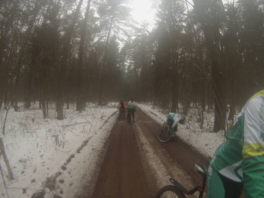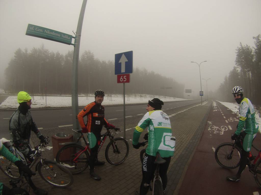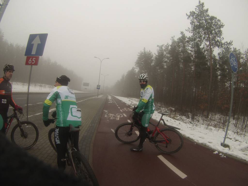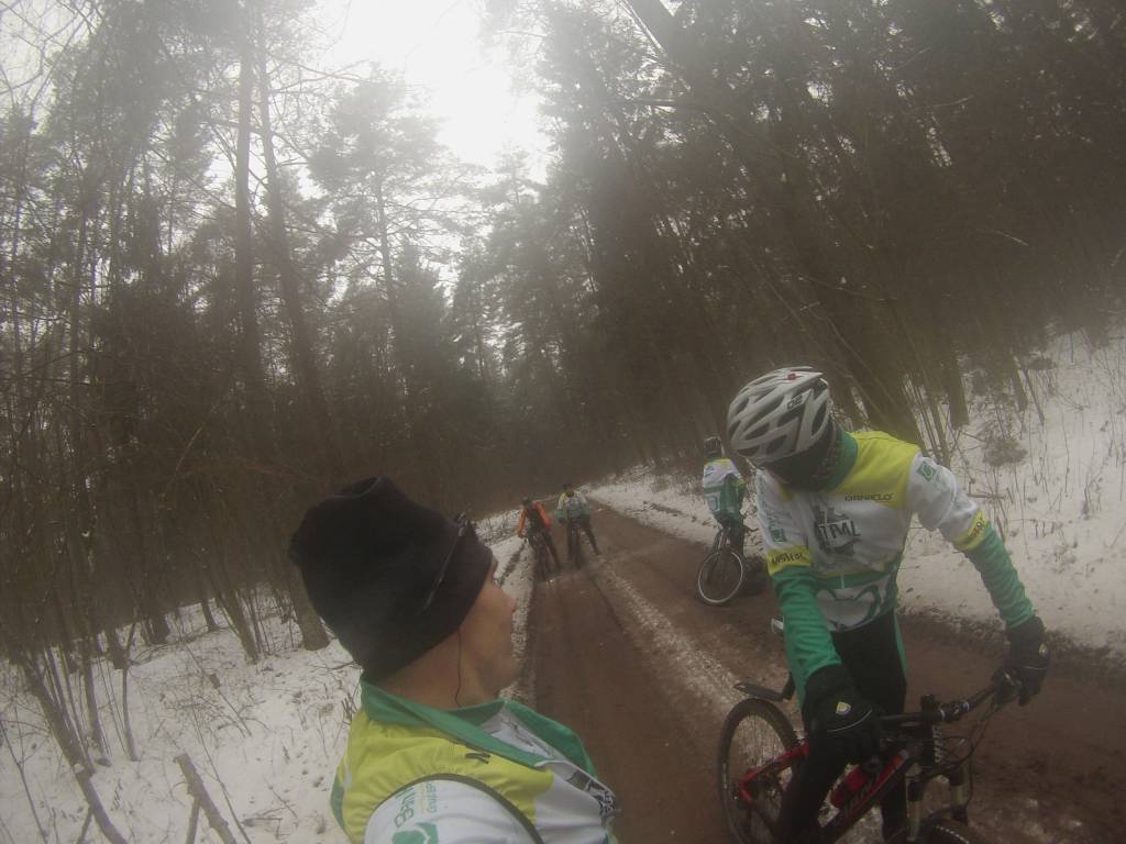 Droga do Żedni przez Sobolewo okazała się bardzo śliska. dodatnie temperatury panujące w dzień rozpuszczają śnieg który w nocy zamarza tworząc cienką warstwę lodu o czym dobitnie przekonał się Łukasz. W Żedni postanowiliśmy jazdę kontynuować asfaltem. generalnie fajna trasa, która mocno dała mi w kość. jednak sprzęt ma znaczenie i 26 calowa zimówka o wadze 17kg nie jest w stanie konkurować z lekkimi karbonowymi 29erami. a silnik jeszcze nie ten (na szczęście) ale to ulegnie zmianie :)