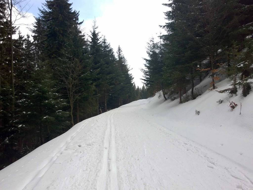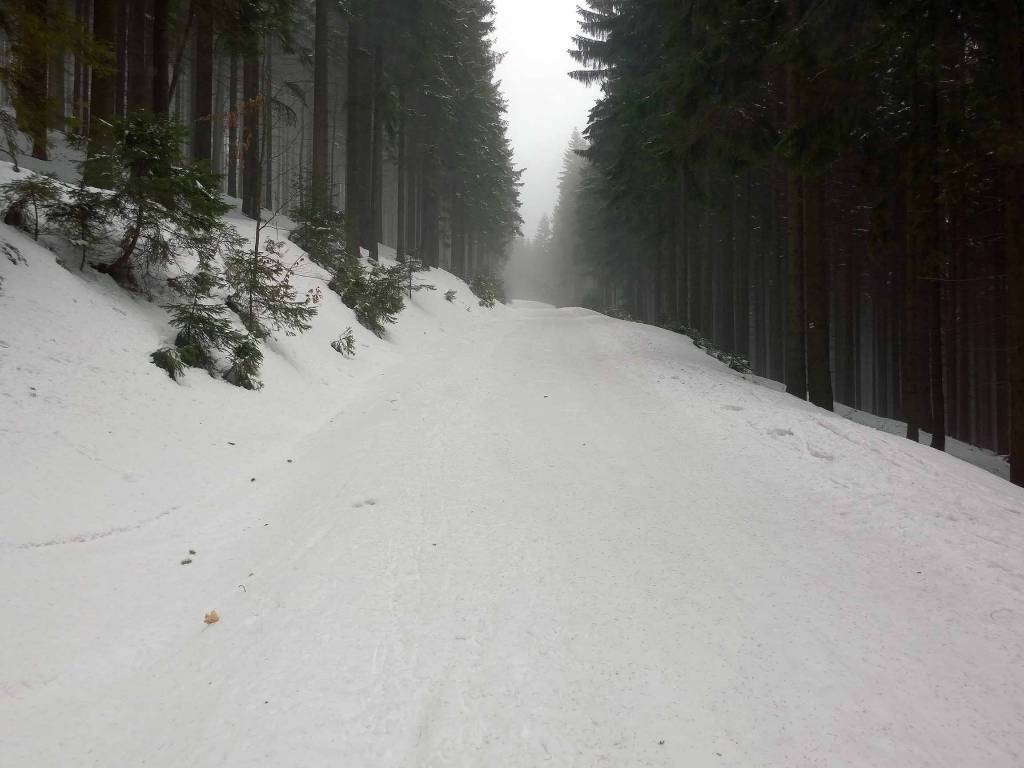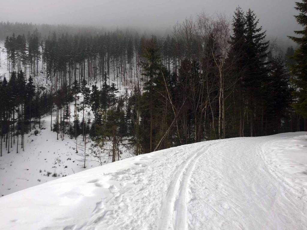 Do Chaty Navrsi tzreba dojść od parkingu jakiś kilometr . Potem można już założyć biegówki i mocno w górę . Im wyżej tym bardziej mgliście . Tu najczęściej są piękne widoki a dziś tylko mgła i wiatr . I choinki podrosły w ciągu dwóch lat , kiedy byłe tu ostatni raz . Na rozdrożu Pod Ludumilą postanawiam zawrócić , szkoda pchać się do góry i tak nic nie będzie widać . Zjazd jest jeszcze bardziej problematyczny niż podejście . Koło Chaty przejaśniało , czasem zerka słońce . To jeszcze przebieżka do górnej stacji wyciągu w Hyncicach