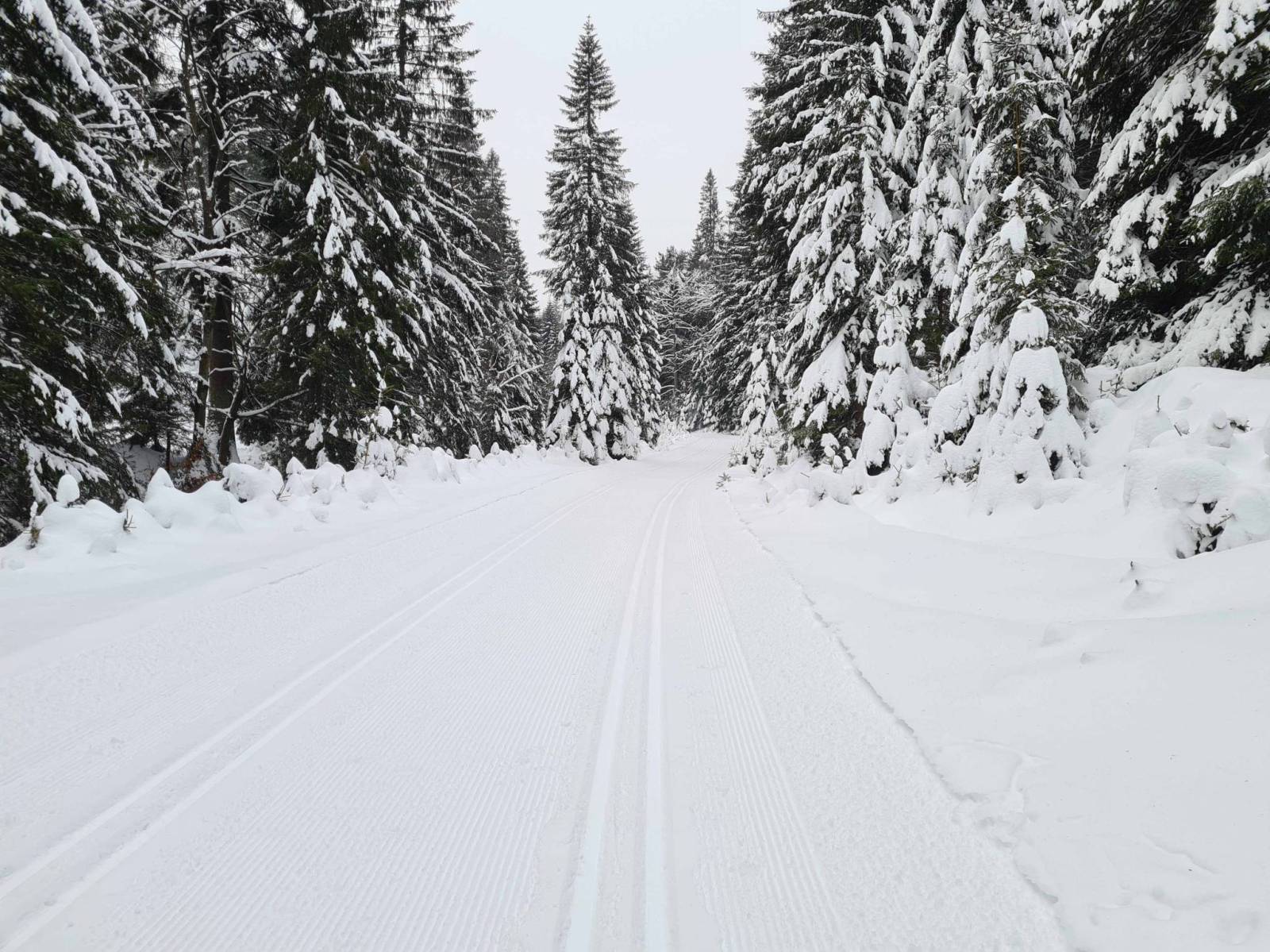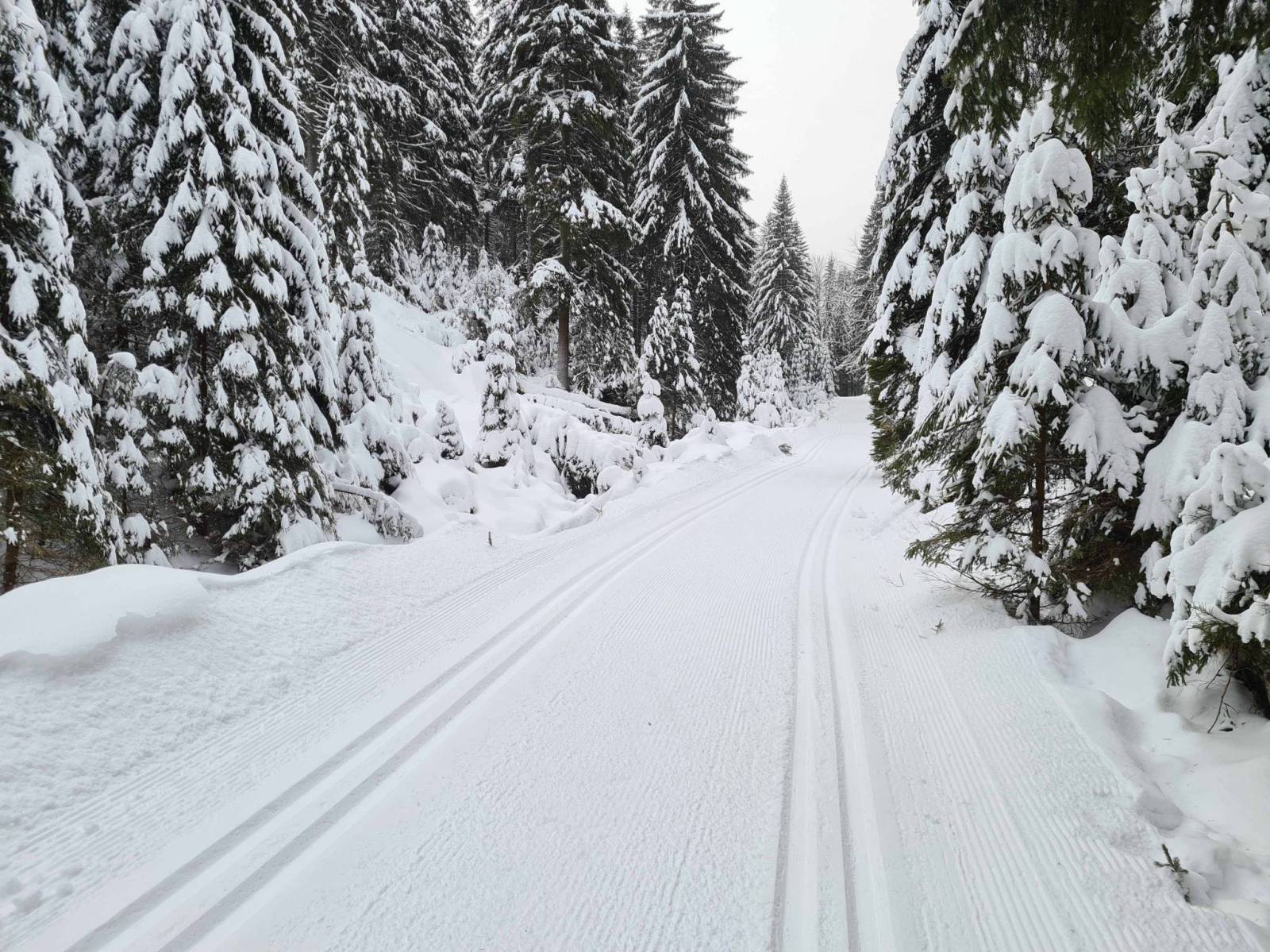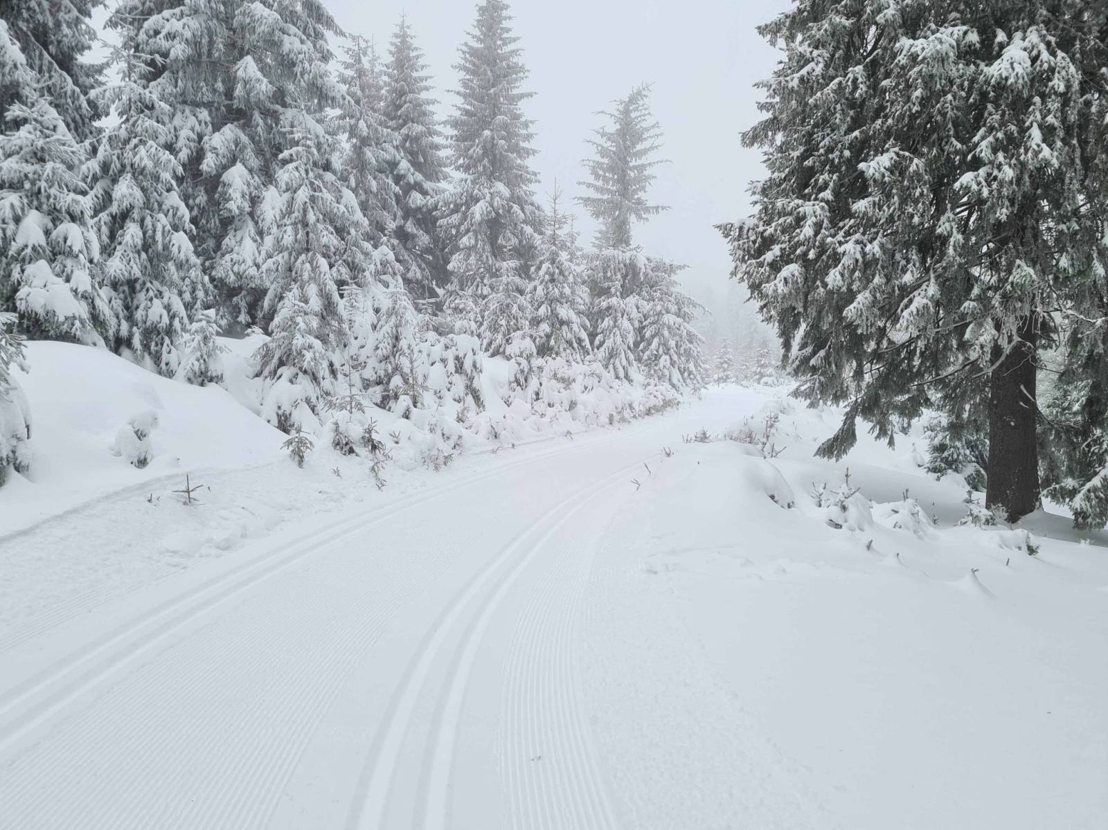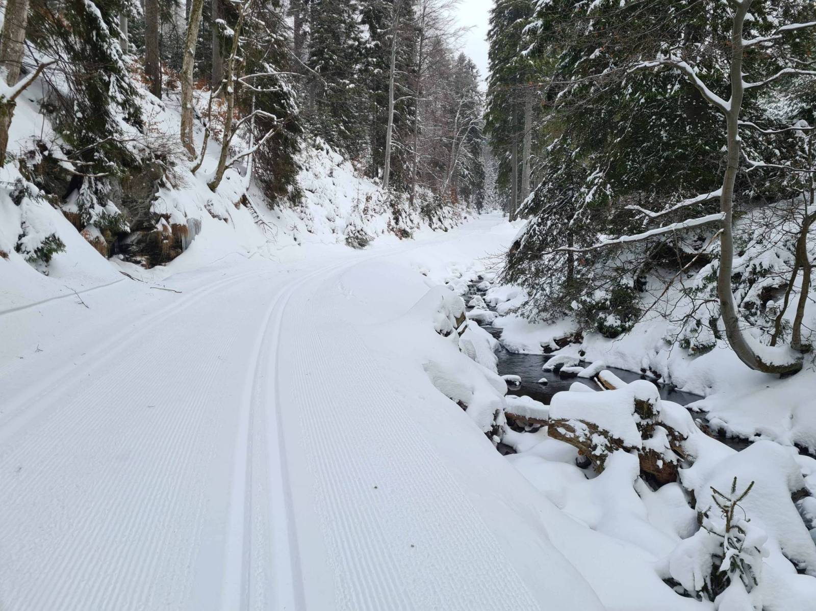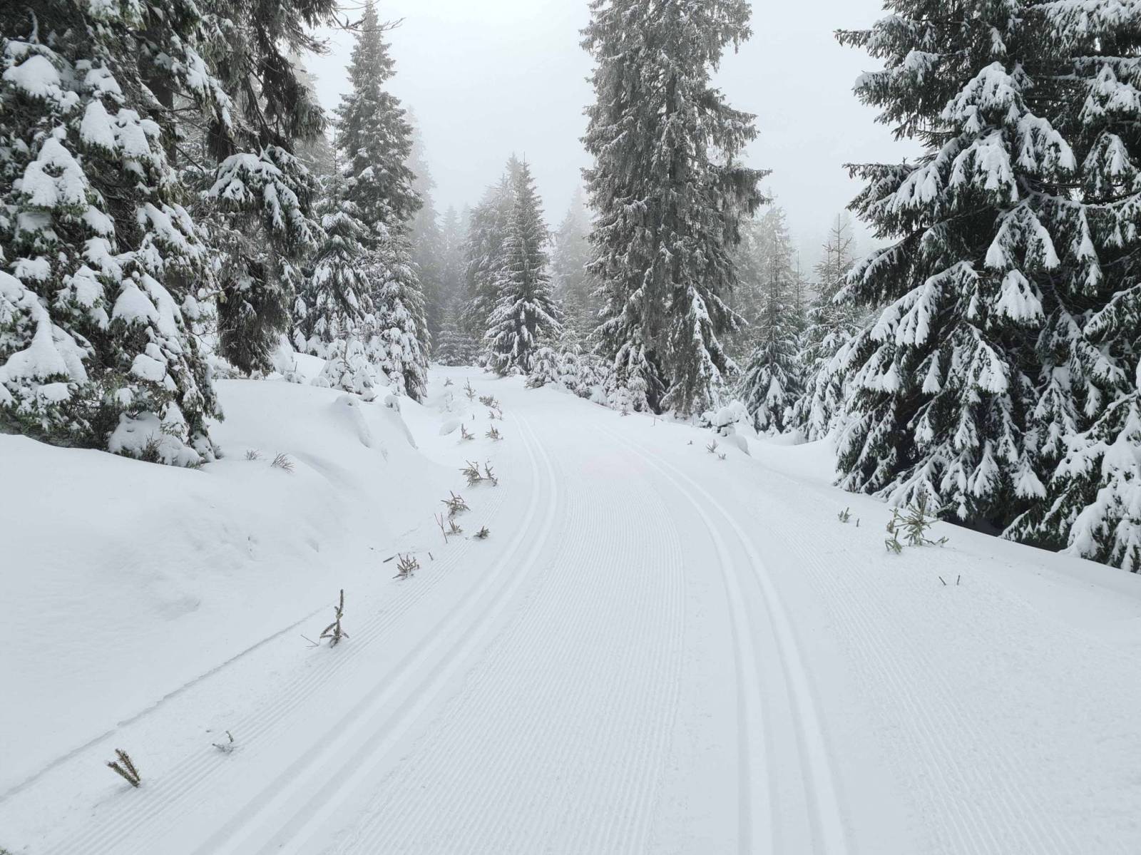 W nocy zrobiło się nagle ciepło , ale śnieg w górach przecież nie zniknął . Mocno wieje wiatr , więc na wszelki wypadek nie wybieram się daleko , niedaleko wszak Bielice . Koło 9 rano na parkingu już kilka samochodów , niby parking nie czynny / szkody powodziowe / . Ale jest przygotowany , odśnieżony , nic tylko parkować . Kilka chwil wcześniej w Bielicach jechał ratrak , więc trasa od początku wyśmienita . Na trasie ruch niewielki , a że Czesi nie świętują dziś , więc czasami przez długi czas nikogo nie widać . Trasy pięknie przygotowane , około plus 2 stopnie C , trochę dokucza wiatr.