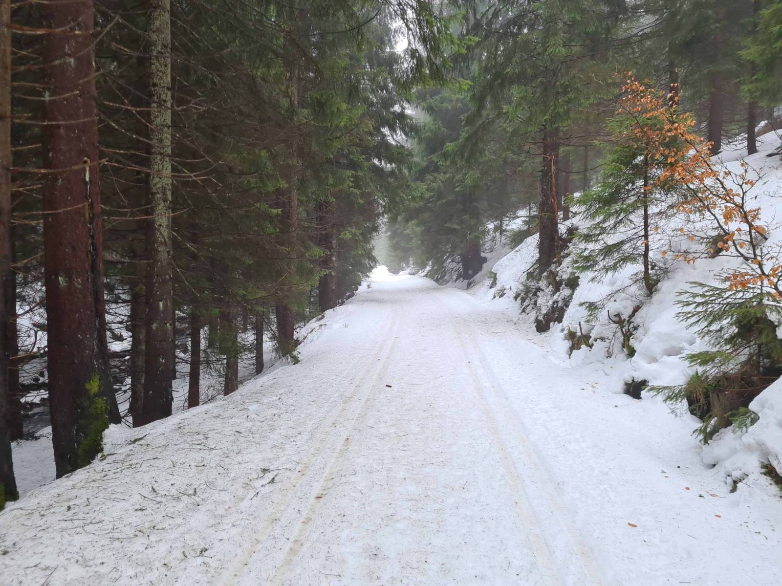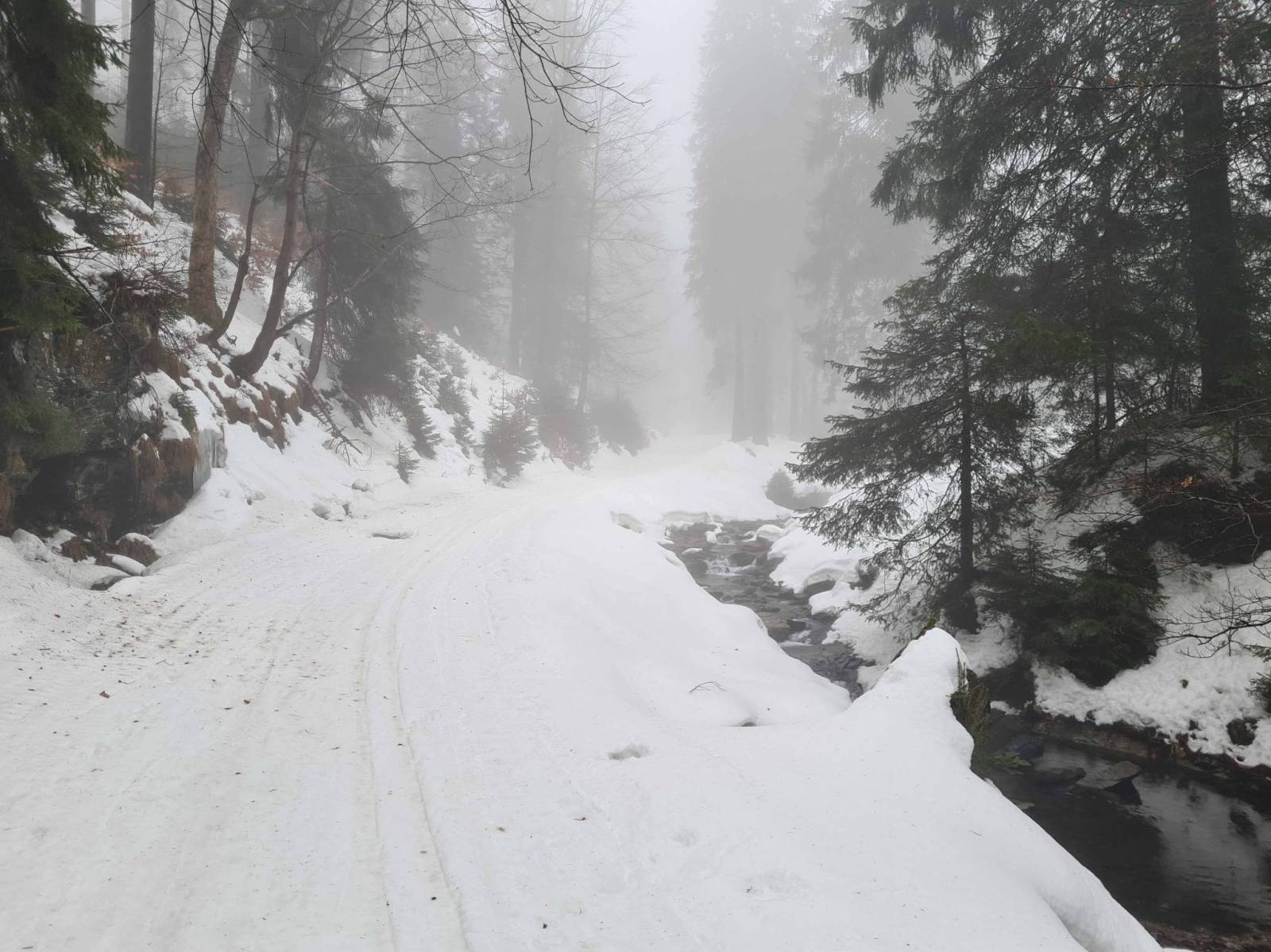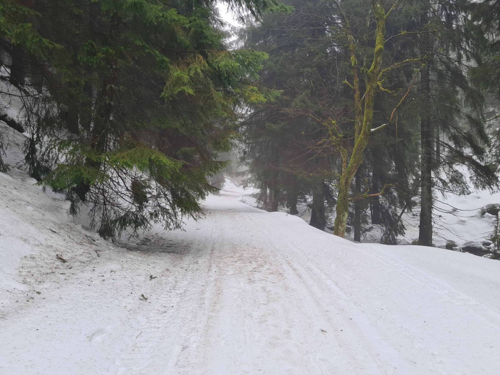 Już nie tylko ciepłe dni , ale też ciepłe noce . W Stroniu Śląskim śnieg znika szybko , za szybko . Nie szukam daleko śniegu i tras biegowych , ruszam do Bielic. Już w Bielicach śnieg leży , parking zlodowaciały i prawie pusty . Bieganie jednak można zacząć praktycznie od samego parkingu . Co prawda pojawiają się już przetarcia , ale nie ma tragedii . Śnieg zbity , twardy . Biegnie się ciężko . W wyższych partiach jest trochę lepiej . Najlepsze warunki dziś na magistrali , tam jechała ratrak . Wieje mocny wiatr i wszędzie mgła . Podobno jutro ma padać deszcz , trzeba korzystać z tego co jest.