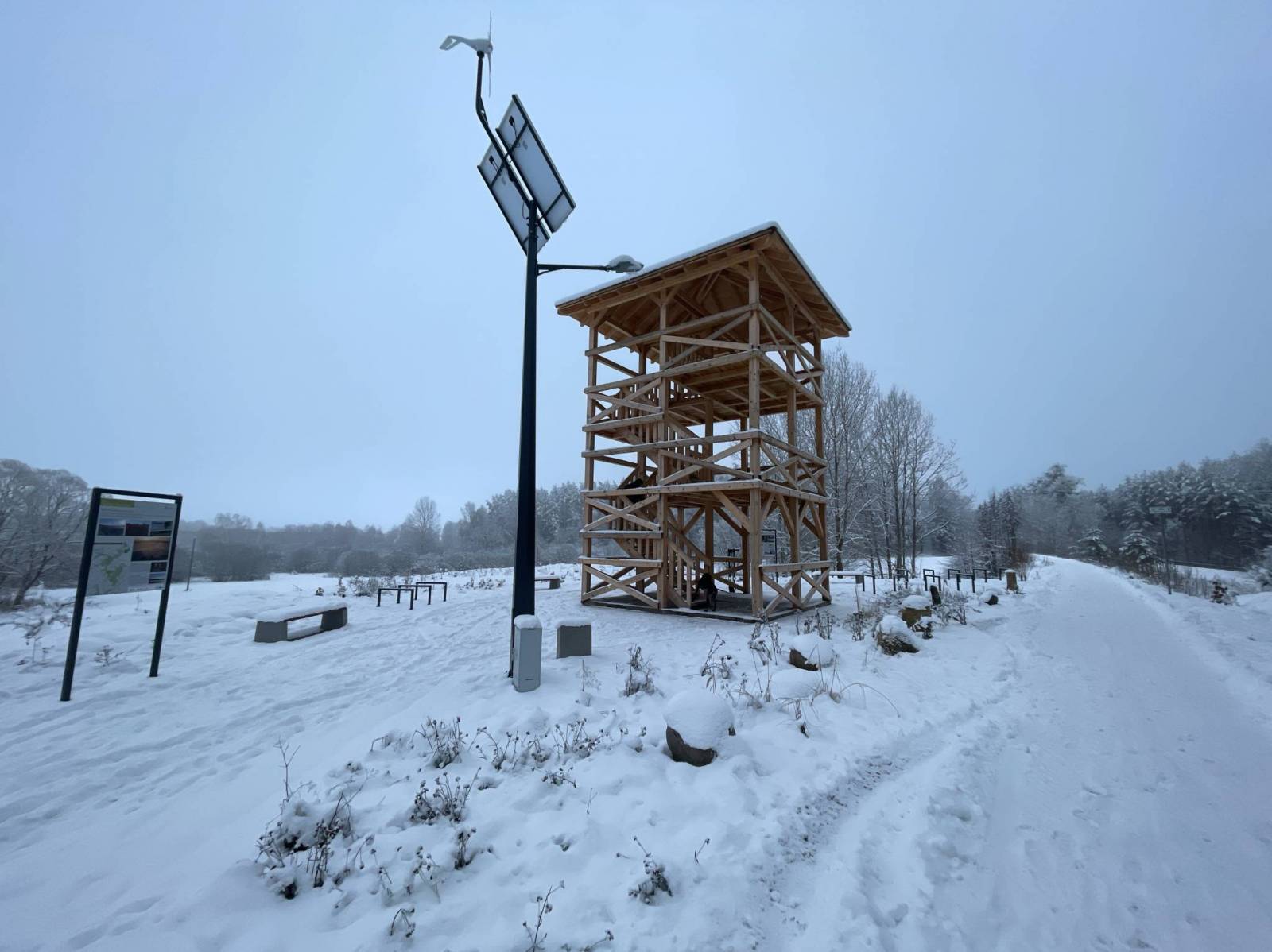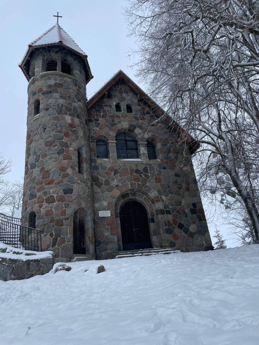 Wycieczka w scenerii zimowej. Pierwszy etap prowadzi ścieżką rowerową przy której stoi wieża widokowa. W Raszągu nie można ominąć pięknego kościoła.
