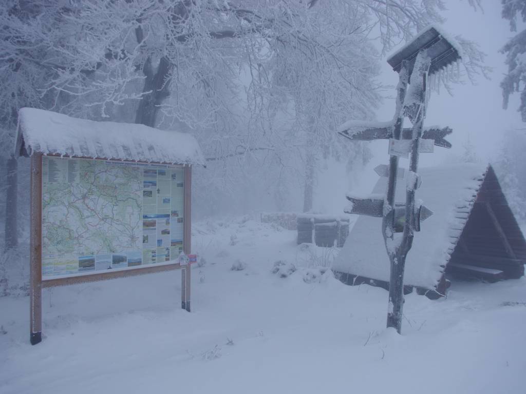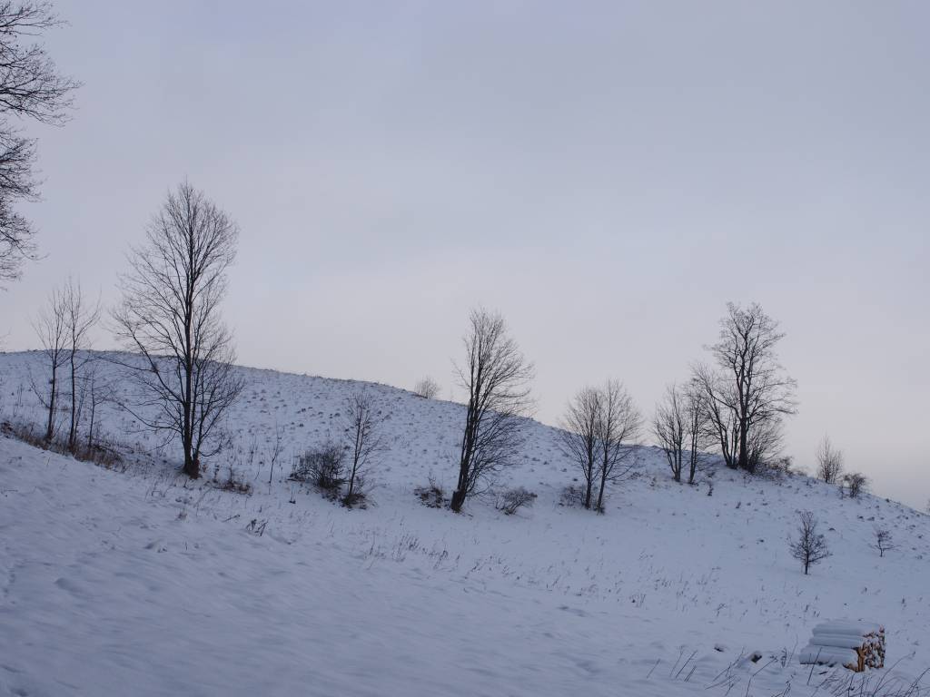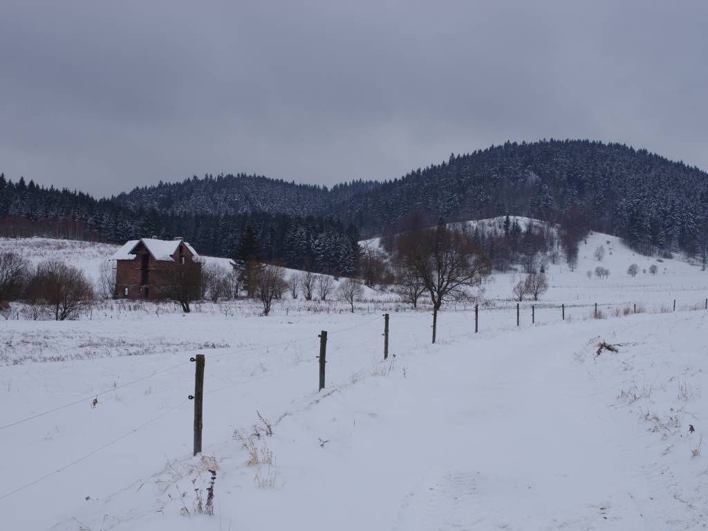Pomimo kilku przerw na trasie od Bugoszów-Gorce do Grzędy odcinek ten był raczej łatwy. Śnieg utrudniał, jednak nie było to silniejsze niż przewidywałem. Od Grzędy do Grzędy Górne trasa biegnie wzdłuż wiosek przy drodze asfaltowej. Za Grzędy Górne zaczyna się stopniowe podejście, o tyle w lecie nie powinno być w tym nic strasznego, to w zimie wszystko wyraźnie staje się trudniejsze. Można powiedzieć że jest to oczywiste, ale dopiero w praktyce można się przekonać jak to jest naprawdę. Stopniowo można zauważyć że drzewa są mocniej ośnieżone, nam dodatkowo pojawiła się mgła. Na Lesistej Wielkiej jest dość spora polana. Fragment zejście z Lesistej jest chyba najbardziej stromym który widziałem na żywo. Podziwiam tych którzy podchodzili tam zimą, oraz tych którzy zaprojektowali ten szlak :) Każdemu kto tam będzie szedł zapadnie on w pamięci.