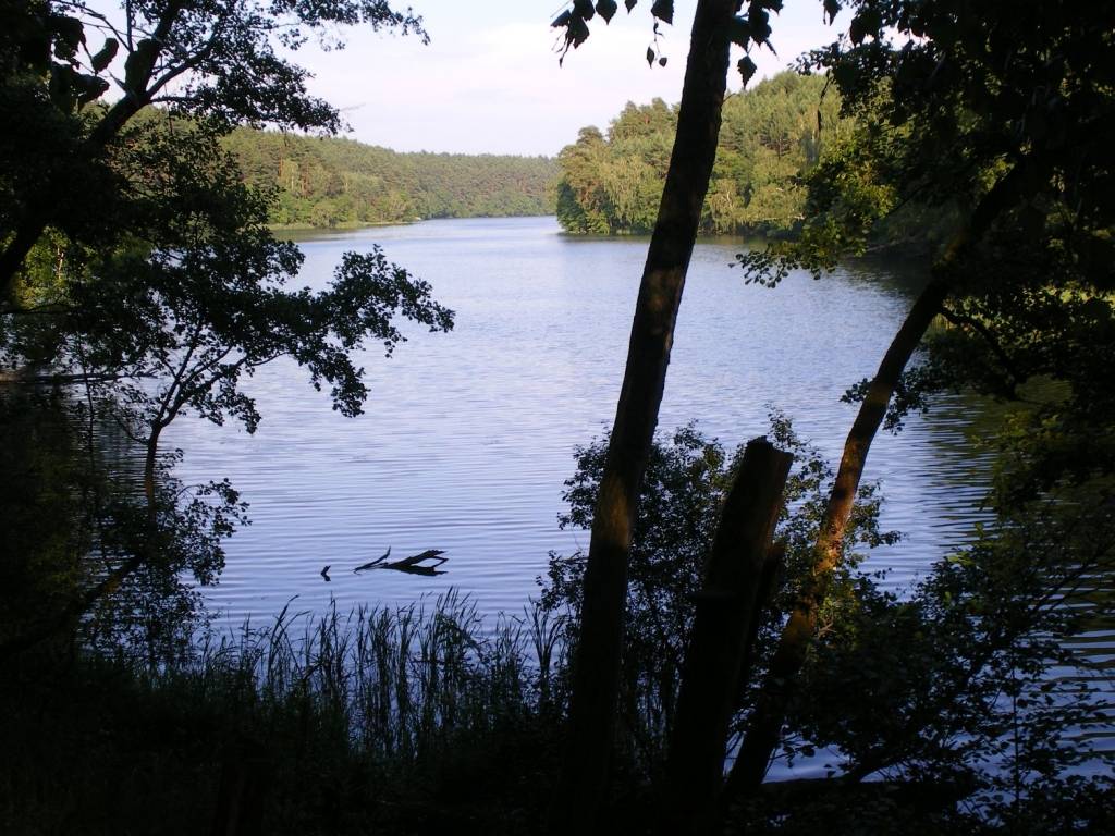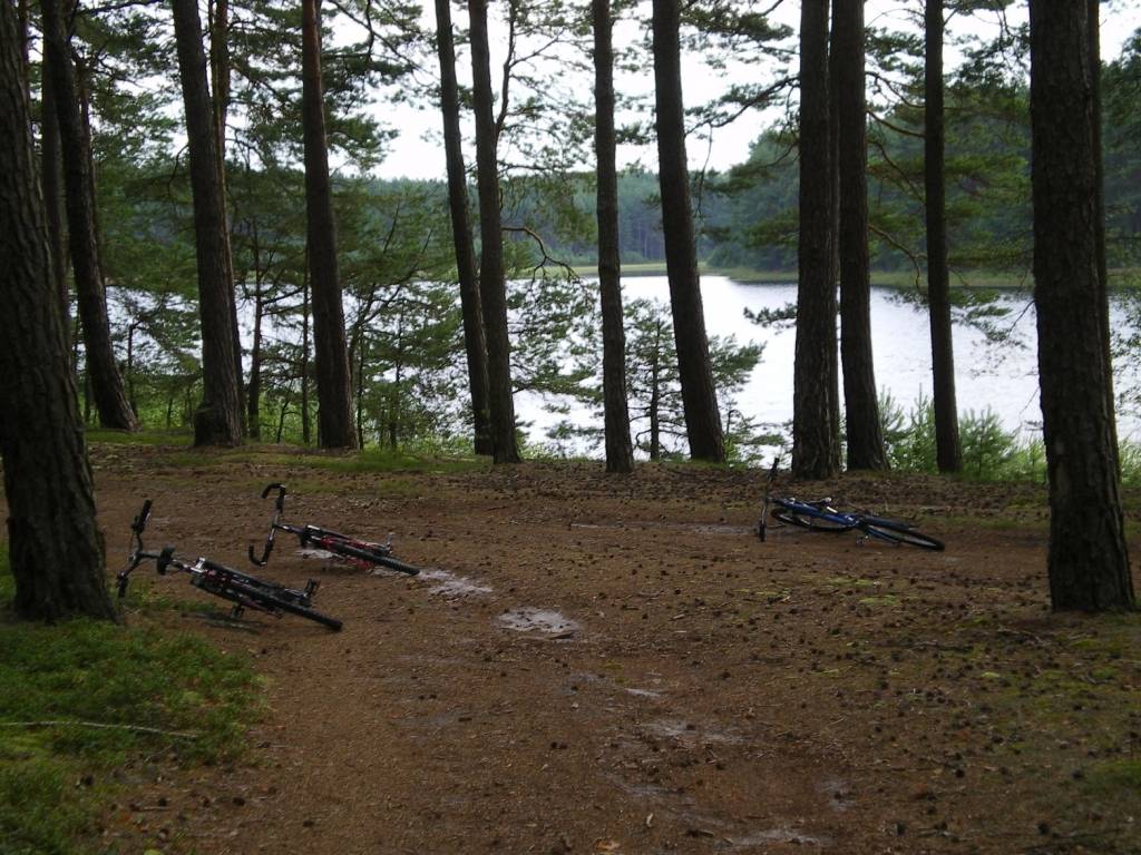 Dojeżdżamy do j. Pleśno i spotykamy rozwidlenie szlaków. Skręcamy w lewo i pieszo pod górę (piasek) podchodzimy kawałek za znakami czerwonymi. Na wzniesieniu szlak skręca w prawo i odtąd jadąc ścieżką z mnóstwem szyszek, z wysokiego brzegu podziwiamy jezioro po prawej stronie na dole.