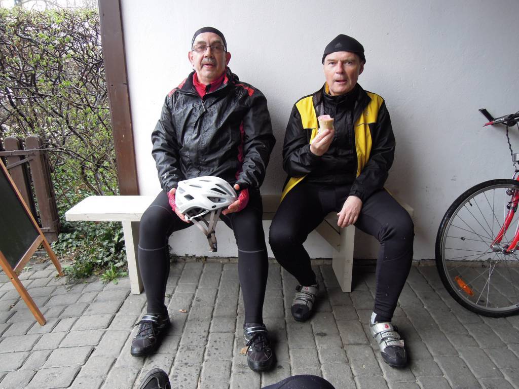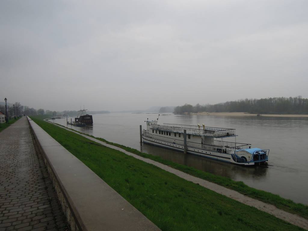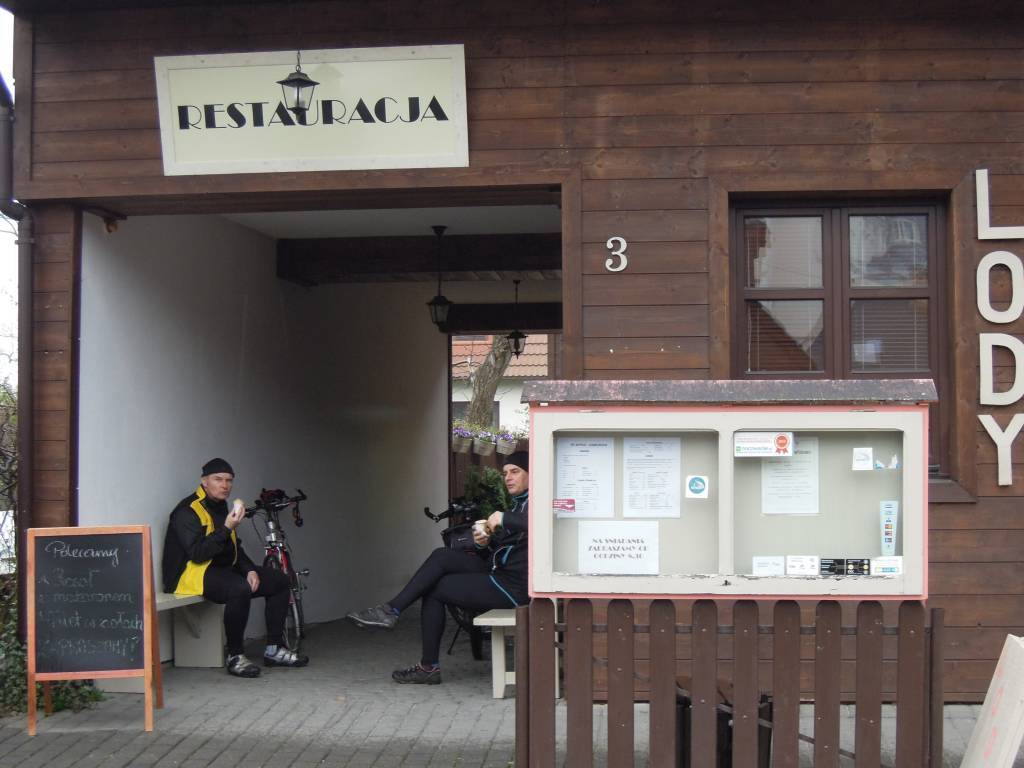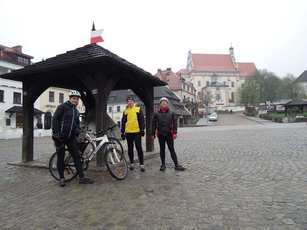 Postanowiliśmy pojechać w stronę Kazimierza Dolnego. Czy do samego miasteczka, czy nawrót w trakcie drogi, to mieliśmy ocenić w zależności od pogody i samopoczucia. Ulicą Sosnową, Kopernika, Ceglaną dojechaliśmy do Włostowic. Potem pustym chodnikiem wzdłuż ulicy Kazimierskiej do początku Parchatki. Tam skręciliśmy do ścieżki rowerowej wzdłuż wału nad Wisłą. Jazda była trochę nieprzyjemna. Nie było specjalnie jakoś zimno, ale krople wody siekały twarz i spływały po okularach zakłócając oglądany przez nie obraz. Jazda przeleciała nam dość szybko i dojechaliśmy do samego Kazimierza. Andre gdzieś się zapodział, bo zatrzymywał się dla zrobienia zdjęć różnym obiektom, a Krys i Darek na widok otwartej lodziarni postanowili zjeść pierwsze w tym roku lody. Wkrótce odnalazł się Andre i pojechaliśmy na duży i mały rynek. Miasteczko było opustoszałe. Pojedyncze osoby pod parasolami na rynku. Nic dziwnego - pogoda do du.y (wstaw zamiast kropki literkę która pierwsza przychodzi ci na myśl). Zrobiliśmy rundkę i postanowiliśmy wracać do Puław, by tam posiedzieć i podtrzymać szlachetne tradycje naszego klubu. Jadąc pewien odcinek asfaltową szosą musieliśmy robić między sobą spore odstępy, ponieważ za tylnym kołem roweru podrywała się mała fontanna kropelek wody, która jadącemu na kole trafiała prosto w twarz. Krys miał najgorzej, bo nie posiadał błotników i woda osiadała również na jego plecach. Dlatego tuż przed metą rajdu, którą był Czarny Piotruś, postanowił na chwilę wpaść do domu, żeby się przebrać. Nie wiadomo jakich argumentów użyła wobec niego jego żona, ale przez telefon powiadomił nas że w Piotrusiu już się nie zjawi. Zjawić nie chciał się też namawiany przez telefon Leon - wyraźnie ogarnęło go tego dnia totalne lenistwo. Wobec tego Andre i Darek sami zakończyli wycieczkę zajadając pizzę. popijając szlachetnym napojem oraz obgadując kogo się da.