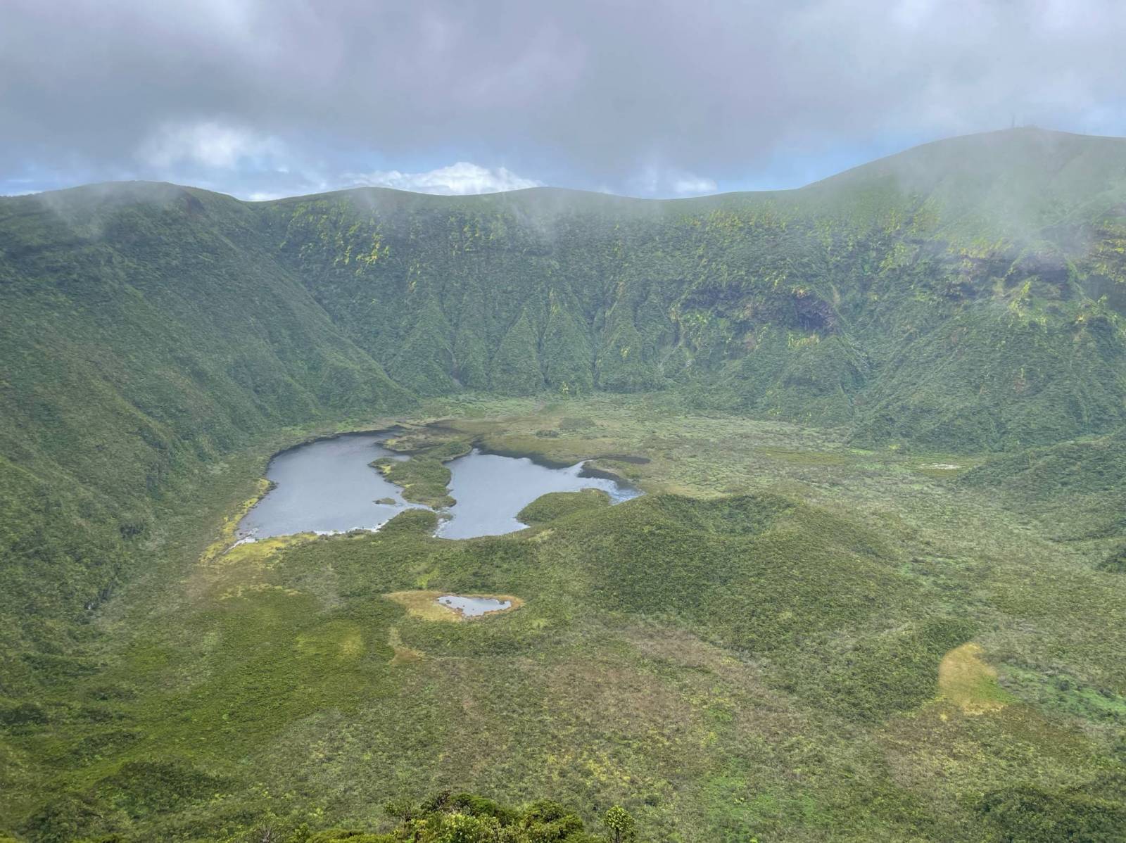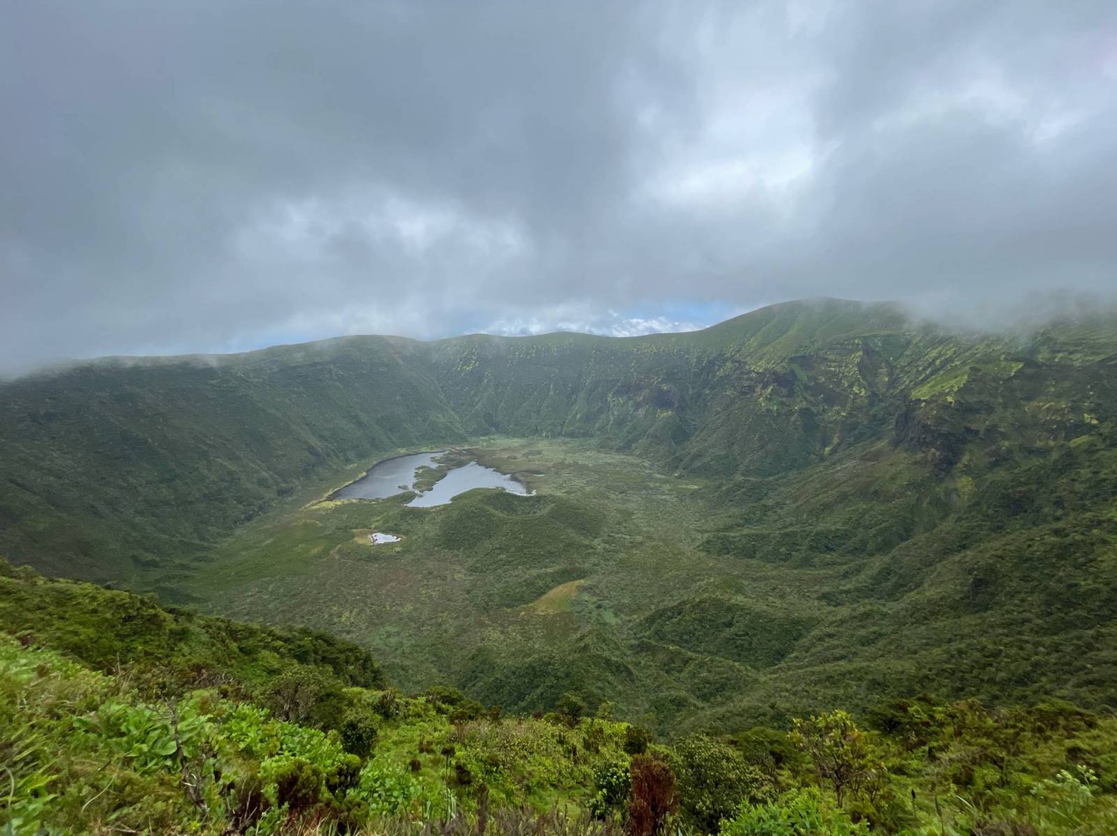 Poznaliśmy kapryśność pogody na Azorach. Przywitał nas deszcz z porywistym wiatrem przy widoczności praktycznie zerowej. Z biegiem czasu chmury zaczęły ustępować odsłaniając piękne widoki kaldery i okolicy. Spacer zakończyliśmy w słońcu i krótkich rękawach.