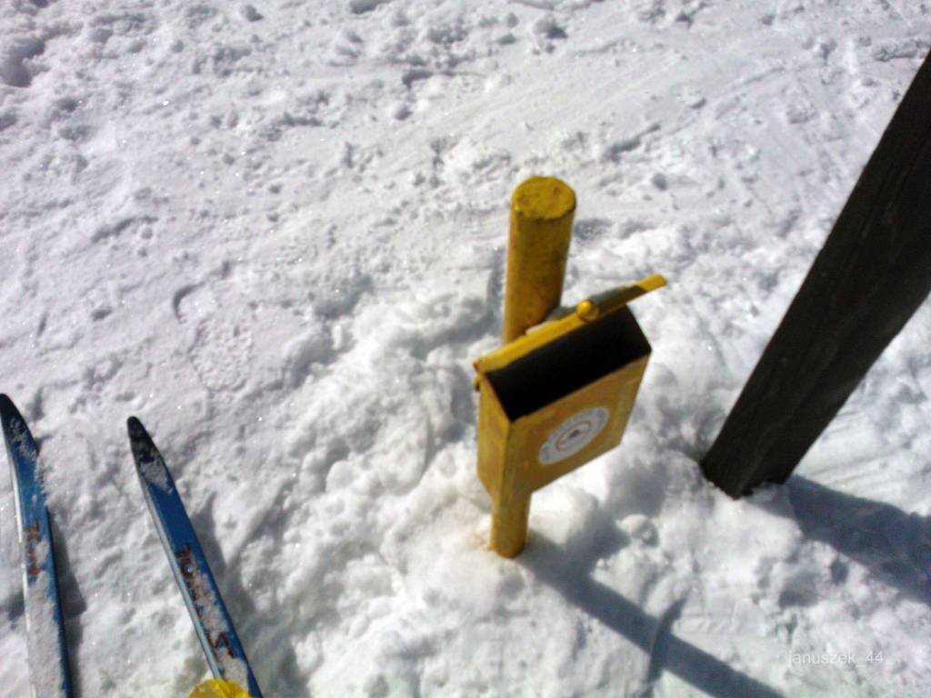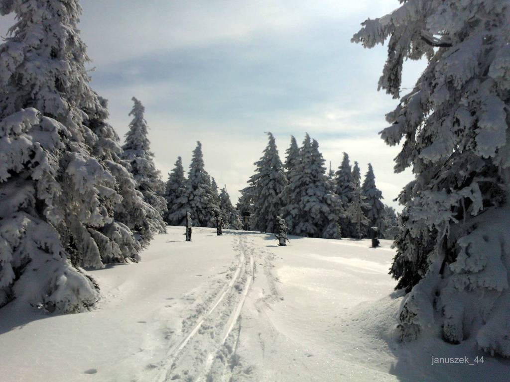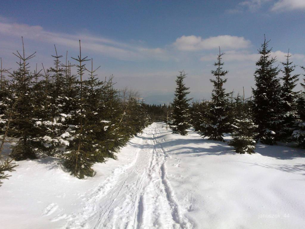 Teraz w kierunku Pod Babusi. Tu się nie da jechać, więc z biegówkami na plecach biegnę. Osiągam drewnianą chatę. Grupa Czechów na biegówkach rozpala ognisko. Ja pędzę dalej. Docieram do nartostrady w kierunku Dolni Morava. Już się cieszę, że teraz pójdzie gładko. Mam już dosyć tych nie przetartych szlaków. Ale szlakowskaz nieubłaganie spycha mnie właśnie na taką nie przetartą ścieżkę.