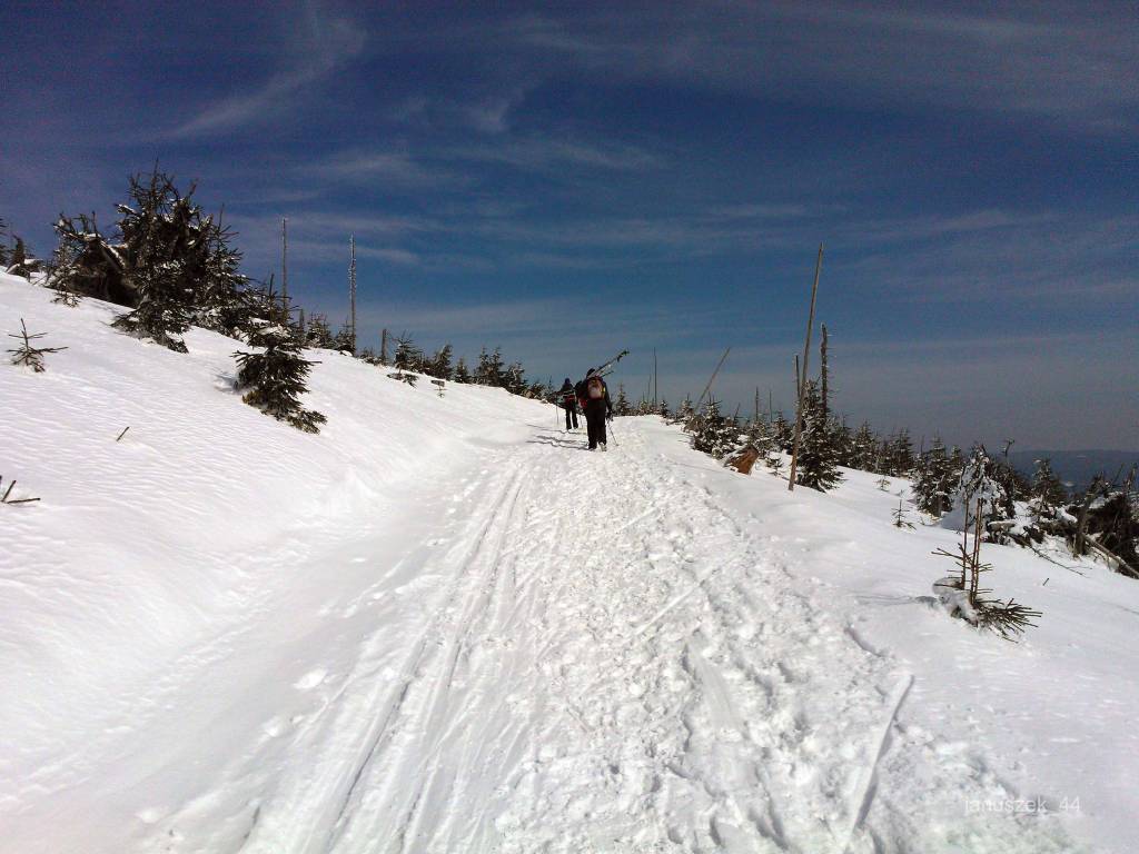 Dojechałem autem do Stribriinic. Auto zostawiłem jak zwykle przed znakiem z nakazem wjazdu. Mimo wiatru dzień zapowiadał się pięknie. Biegówki na plecy i zasuwam do Chaty Navrsi. Ręce mi zmarzły, ale za chwilę, za chatą zakładam narty. Zaraz będzie gorąco. I faktycznie jest. Słonce z lekka przygrzewa. Śladu narciarskiego zupełny brak. Za to ostro pod górę i jakoś tak ciężko, dziś rekordów nie będzie. Z trudem docieram do Stribrinickiego Sedla. Teraz w lewo. Na Śnieżnik było w prawo. Jest jakiś ślad w kierunku Susiny. Może jakoś to będzie. Trasa pnie się ostro w górę. Widoki takie, że nie ma czasu na myślenie o zmęczeniu.