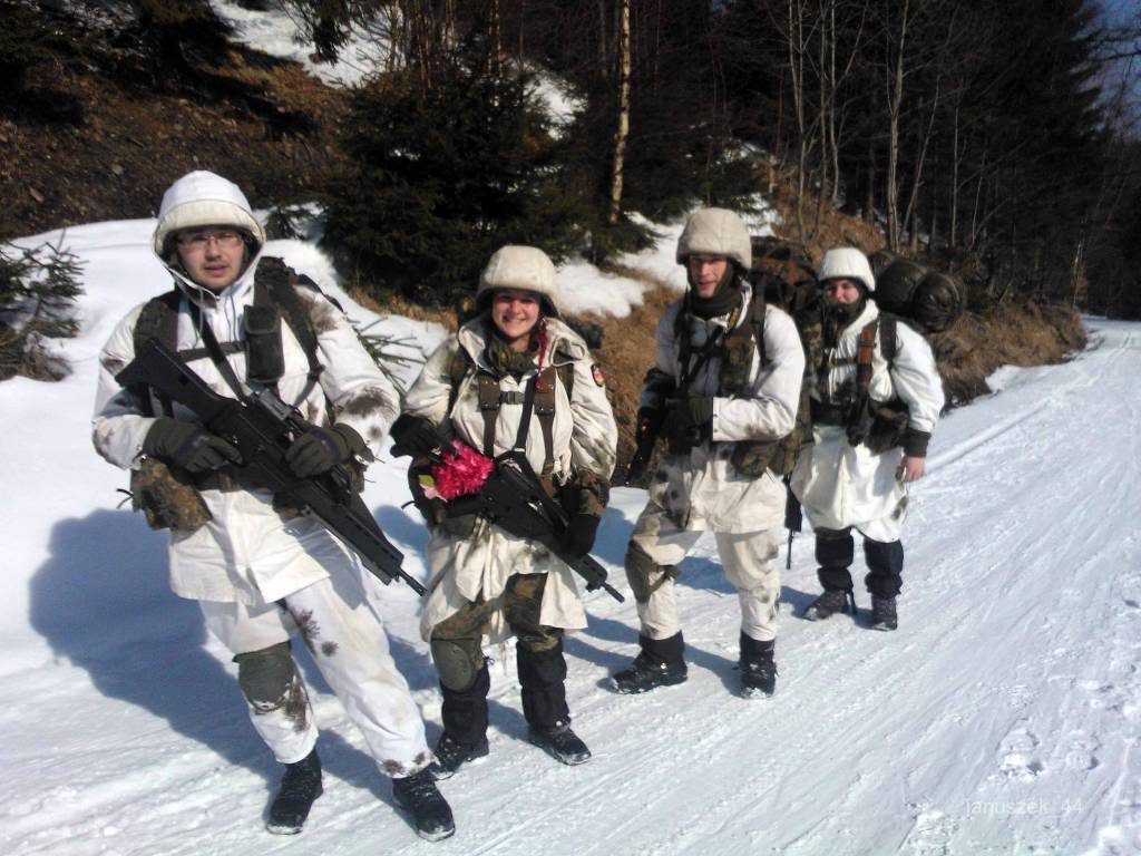 Więc zjeżdżam. Pod warstwą świeżego śniegu nie widać, jak nierówny to teren. Wyginając się na wszystkie strony, momentami bojąc się, aby nie wpaść w przepaść docieram do Prudkiego Potoku. Tu już byłem. Zaraz będzie nartostrada. Faktycznie w oślepiającym słońcu widzę nartostradę i coś co przypomina uzbrojonych żołnierzy z bronią maszynową. Czuję się trochę nie swojo. Nic rano nie mówili w TV…. Podjeżdżam bliżej… może to zmęczenie… ale nie - 4 osoby ubrane jak regularne wojsko. Za ich zgodą robię im zdjęcie. Humor mi się poprawia. W końcu przecież nie oszalałem…..