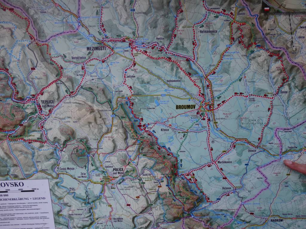 Mapa obejmuje bardzo atrakcyjną turystycznie czeską część Gór Stołowych. Podobnie jak w polskiej części masywu, także ten region obfituje w przeróżne ciekawe formacje skalne. Ciekawym szczytem Broumowskich Ścian jest leżąca nieopodal Koruna z punktem widokowym i interesującymi formacjami skalnymi na szczycie, natomiast za największą atrakcję uchodzi góra Hvězda (674 m n.p.m.), na której szczycie, na skalnej krawędzi, znajduje się barokowa kaplica Matki Boskiej Śnieżnej, wykonana z piaskowca ciosowego (zbudowana na podstawie pięcioramiennej gwiazdy). Miasta skalne znajdujące się w Adršpašskoteplickich skálach są jednym z najbardziej znanych piaskowcowych terenów wspinaczkowych na świecie. Między labiryntami form skalnych przebiega płatna trasa turystyczna niewymagająca żadnej wprawy przy chodzeniu po górach, składająca się z wygodnych schodków, poręczy, drabin i miejscami sztucznie wybudowanych chodników i platform. W pobliżu znajduje się też Teplickie Skalne Miasto – nieco mniej znane od Adršpašskoteplickich skál, lecz rozleglejsze, wyższe i bardziej dzikie.