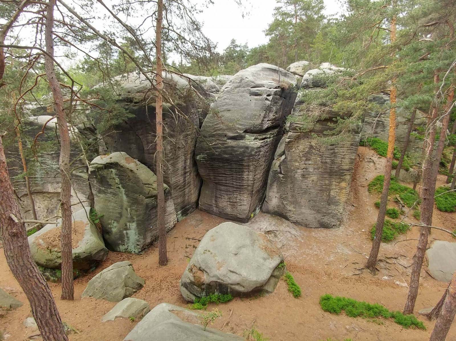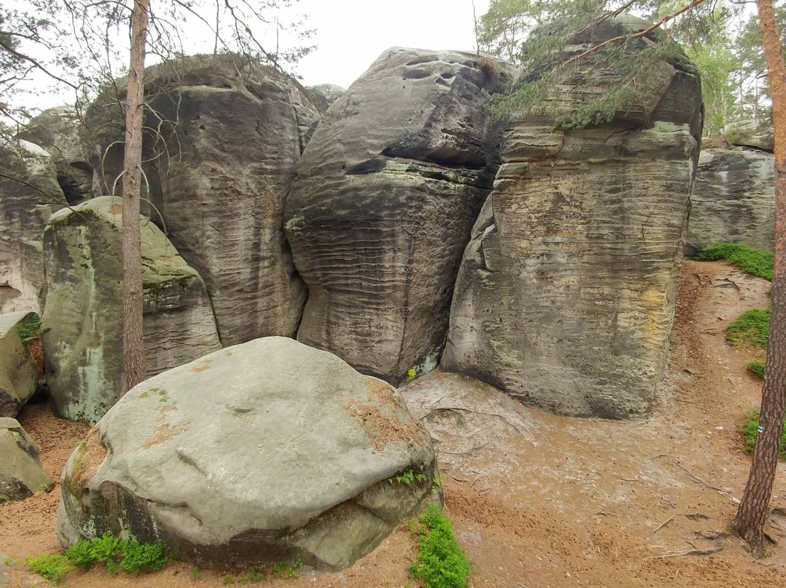 Podążamy czerwonym szlakiem. 300m dalej odbijamy w lewo, mijamy amfiteatr i kawałek dalej skręcamy w lewo na szlak niebieski, który wyprowadzi nas do skalnego labiryntu. Na skrzyżowaniu szlaków, kontynuujemy trasę szlakiem żółtym, który stanowi pozostałą część trasy.