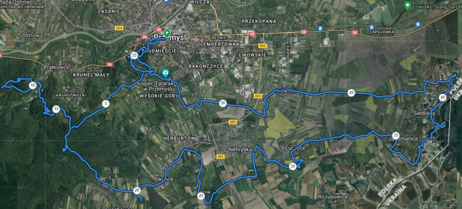 Dystans „Cesarski” ok. 55 km Trasa biegu wiedzie głównie południowo – wschodnią częścią pierścienia zewnętrznego Twierdzy Przemyśl. Start z okolic Przemyskiego Rynku, tu rozpoczynamy wspinaczkę urokliwymi uliczkami na Przemyski Zamek dalej alejkami Parku Zamkowego w kierunku wyciągu narciarskiego następnie przez Zielonkę biegniemy w kierunku Prałkowiec, tu po 11km docieramy do Fortu VII Prałkowce. Powrót w kierunku Zielonki i na 16 km docieramy do Fortu VI Iwanowa Góra potocznie nazywanego fortem Helicha, dalej przez Fort V Grochowce, Fort IV Optyń w Pikulicach i na 28 km dobiegamy do Fortu III Łuczyce. Z Łuczyc kierujemy się na Fort II Jaksmanice, następnie Fort I Siedliska „Salis Soglio” i na 38 km mijamy ostatni fort na trasie biegu Fort XV „Borek” i wracamy do Przemyśla przez Krówniki, Kopiec Tatarski, trasą downhillowa przy wyciągu narciarskim, Park Zamkowy, Zamek do mety w okolice Przemyskiego Rynku.