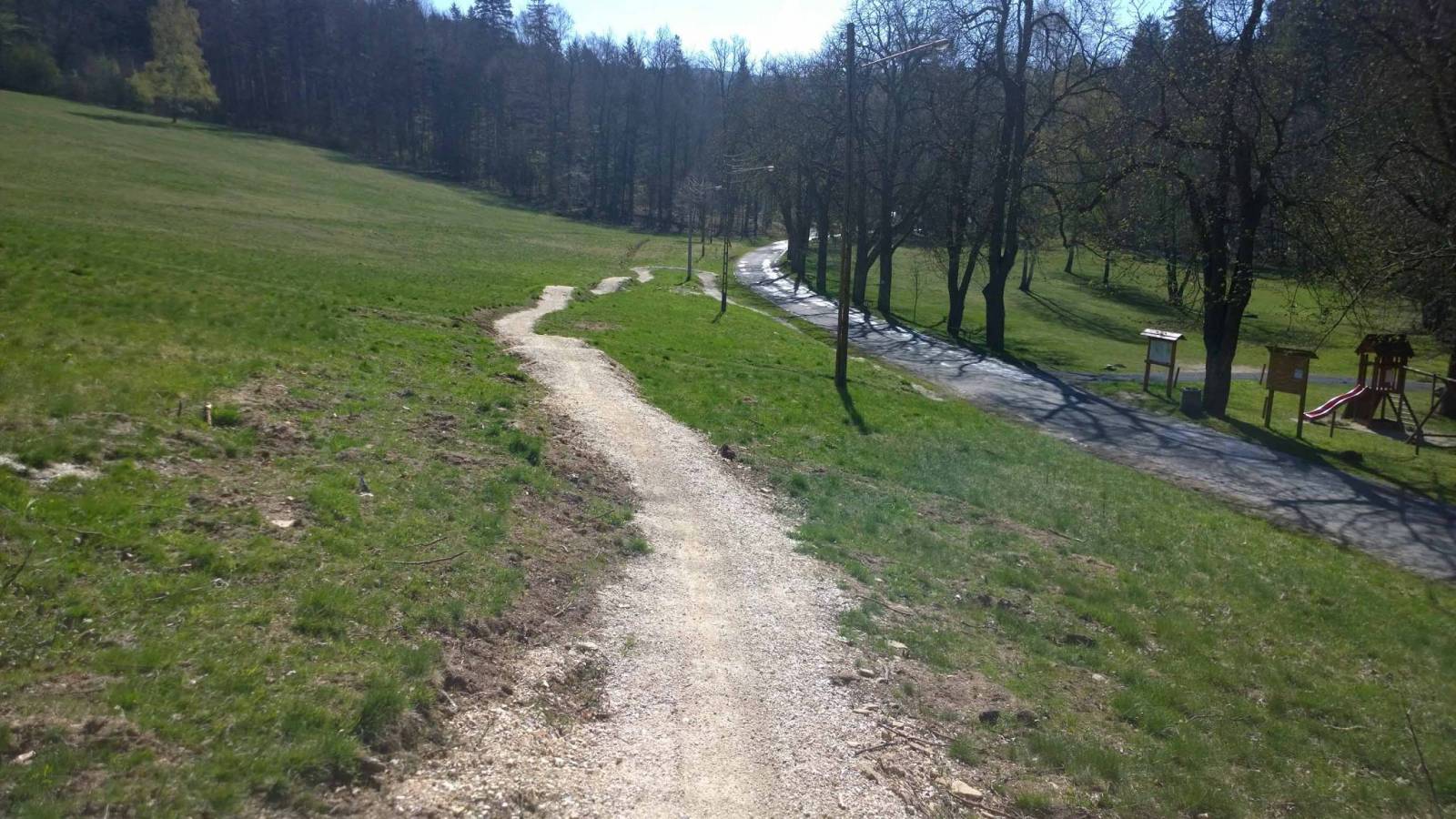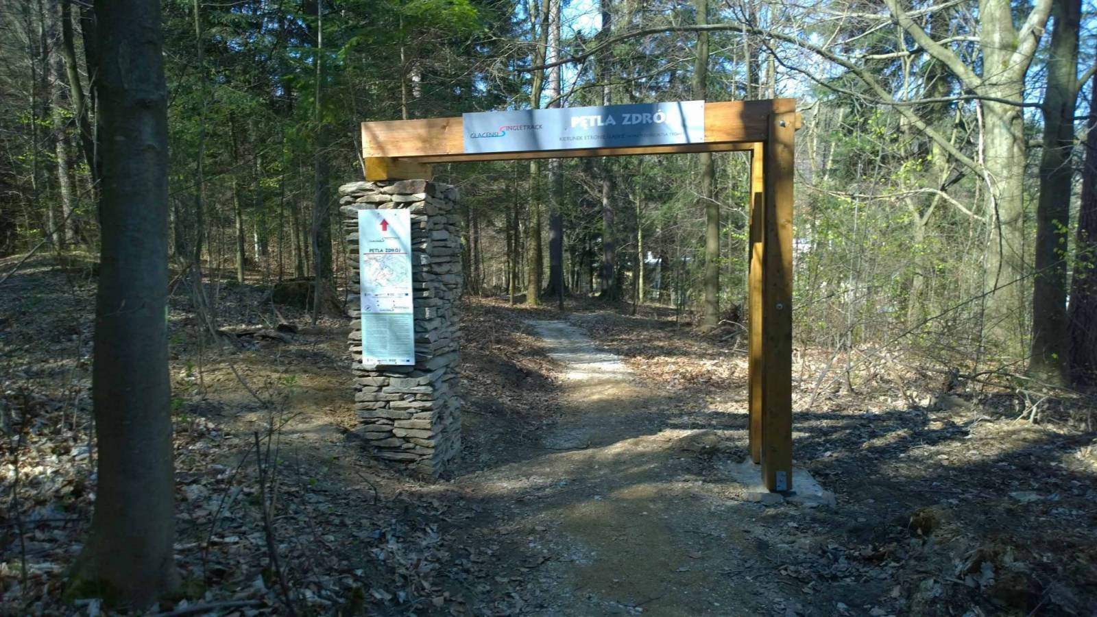 Dziś krótka trasa w okolicy Lądka Zdroju , krótki dojazd ze Stronia . Na wysokości Hurtowni Budowlanej w Stójkowe wjeżdżam na trasę . Oznaczenia już . Trasa przyjemna , dużo "hopek " , kilka przeszkód w postaci przewróconych drzew , niedokończonej trasy . Nie jest źle . Przy Stawach Biskupich w Lądku Zdroju trasa nagle się gubi , tak trochę na czuja odnajduję jedyną na tej trasie bramę wjazdową .