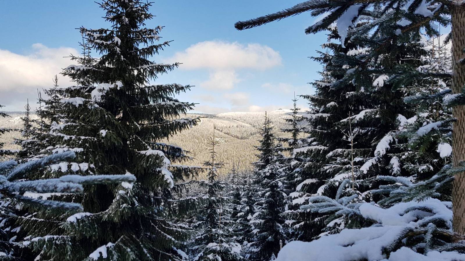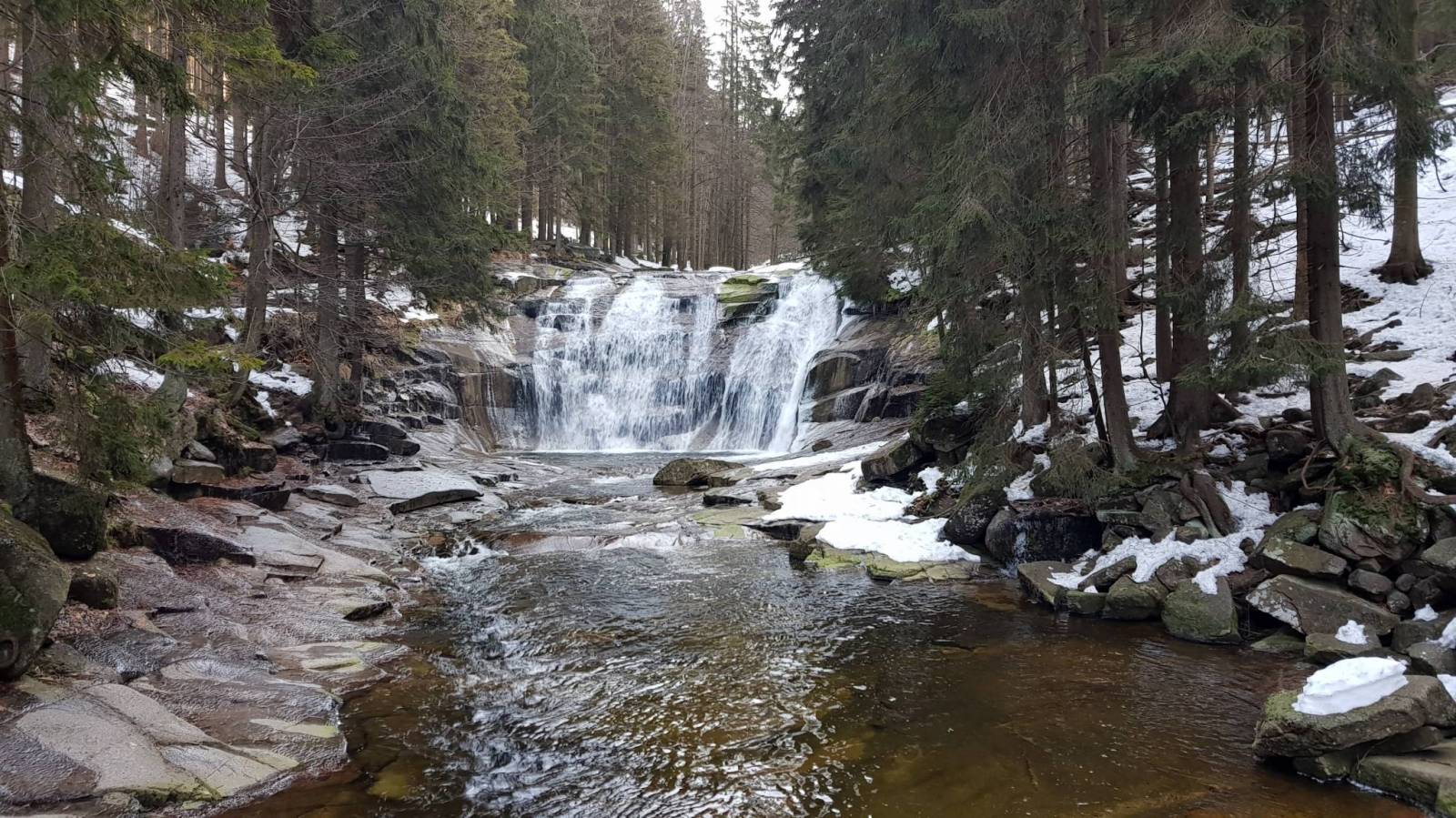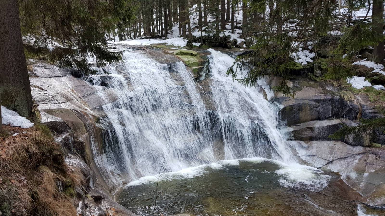 Tym razem postanowiliśmy przejść się na butach trasą od Harrachova. I dobrze bo tu dość stromo na biegówki, choć to trasa biegowa. Po drodze wodospad Mumlavy.