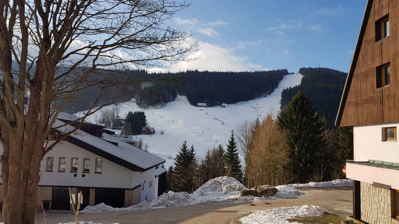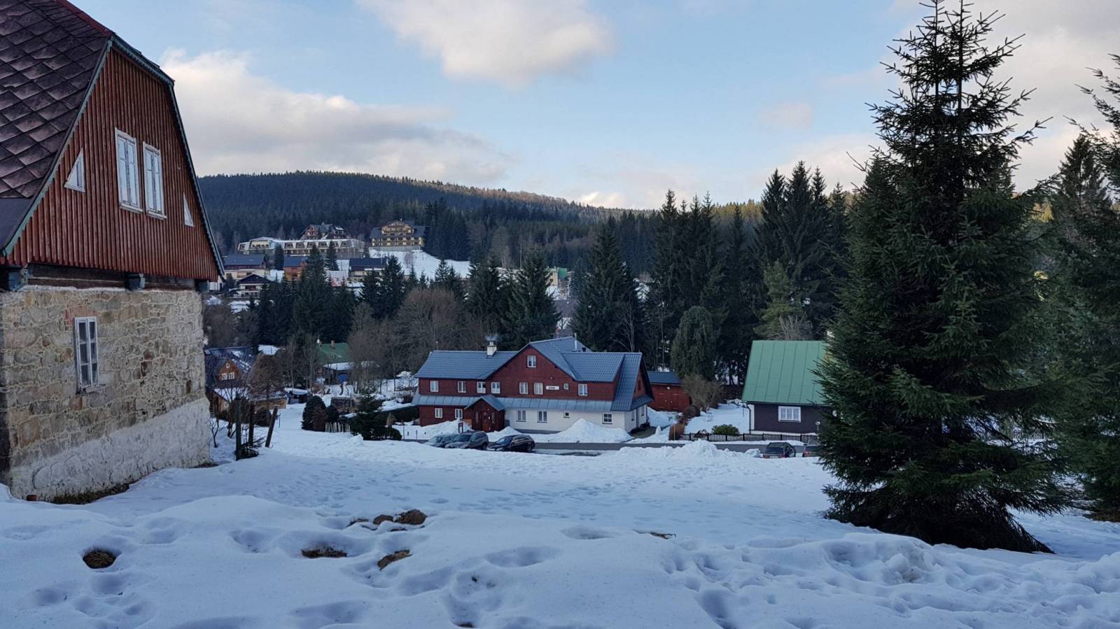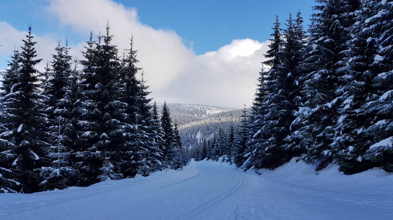 Tym razem postanowiliśmy przejść się na butach trasą od Harrachova. I dobrze bo tu dość stromo na biegówki, choć to trasa biegowa. Po drodze wodospad Mumlavy.