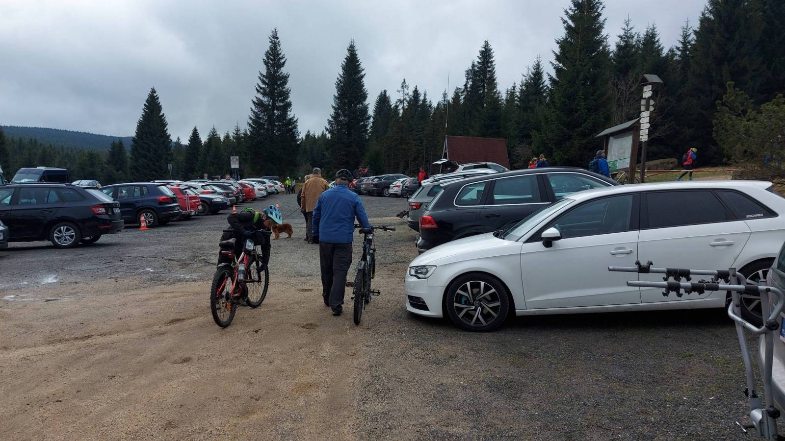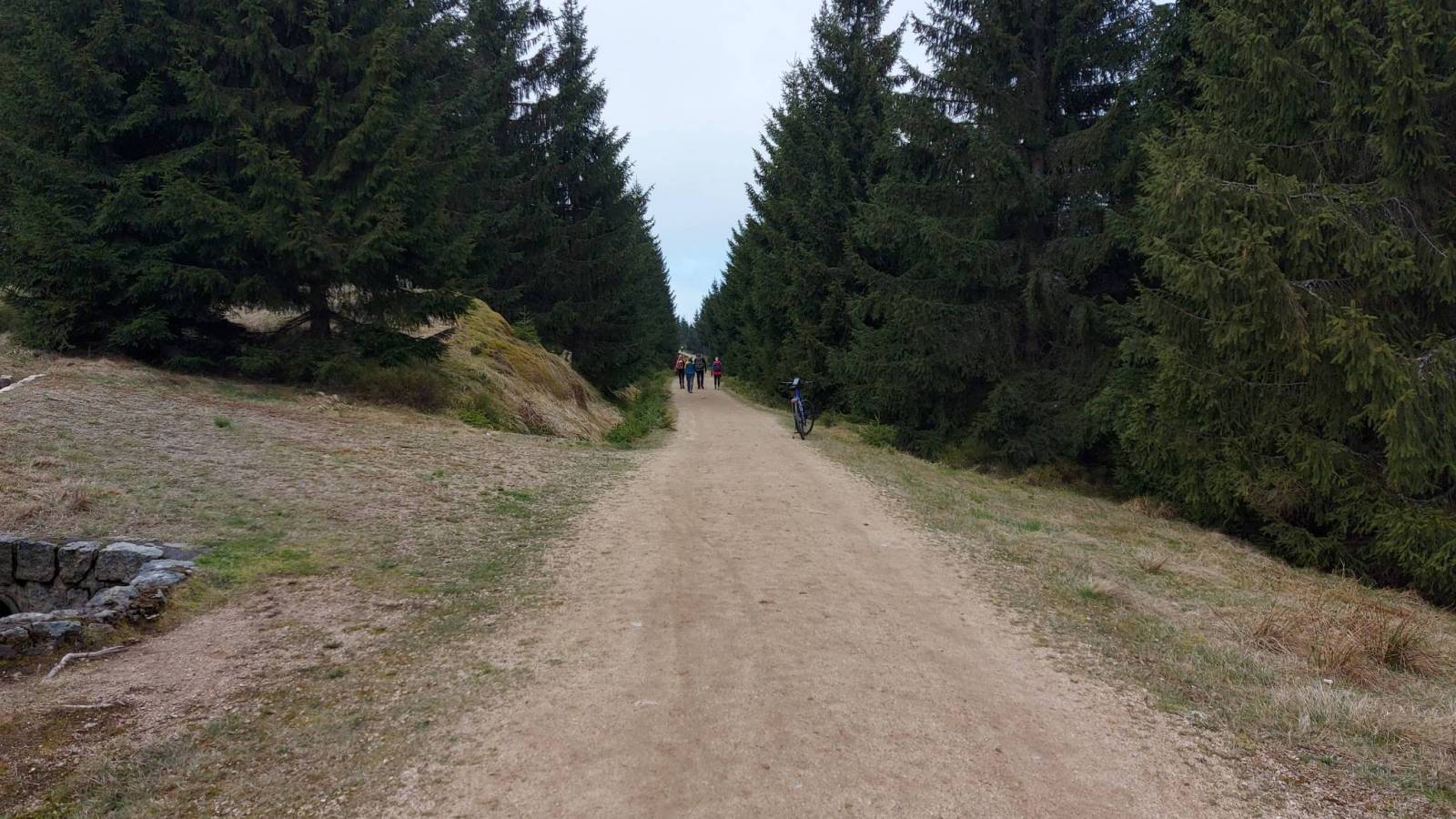 Rowerowo-piesza wycieczka w górach Izerskich. Początek na płatnym parkingu Smedava. Można płacić w złotówkach a cena to 20 zł. Z parkingu udaliśmy się na rowerach tzw. Stolpiską Silnicą trawersując zbocze Izery do rozdroża U Kneipy. Odcinek ten na początku dość stromy właściwie nie jest dopuszczony do ruchu rowerowego ale nie byliśmy tam na rowerach jedyni. Od rozdroża na którym faktycznie jest knajpa ,zresztą dość mocno oblegana, jechaliśmy już regularną drogą rowerową aż do odejścia szlaku na Holubnik przez Ptasie Kopy. Po drodze jeszcze krótki postój i wizyta na punkcie widokowym Krasna Mari z którego wspaniale widać Hejnice i rejon Smrka i Frydlandzkiego Cimburza.. Od skrzyżowania pod Ptasimi Kupami rozpoczęliśmy pieszy fragment wycieczki na bardzo widokowe Ptasie Kopy i Holubnik. Tam i z powrotem to około 4 km a po drodze są nawet klamry i kilka metrów łańcucha. Widoki oczywiście jeszcze lepsze niż z Krasnej Mari. Widać góry w wszystkich kierunkach oraz dwa zbiornik wodne Bedrichov i Josefuw Dul. W drodze powrotnej udaliśmy sie jeszcze na torfowiska Na Cichadle które można oglądać z małej wieży widokowej znajdujacej się parę metrów od ścieżki rowerowej. Dojazd do parkingu po drugiej stronie Izery już drogą rowerową.