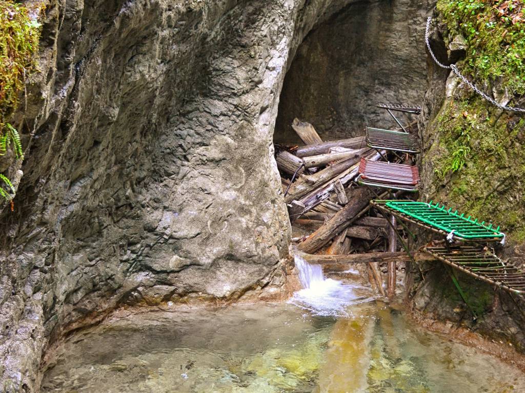 Potem znowu maszerujemy kawałek lasem nim pojawia się trochę wyższy wodospad. Nie wygląda zbyt atrakcyjnie ze zwalonym drzewem, a w dodatku drabinka cała się chwieje. -foto314