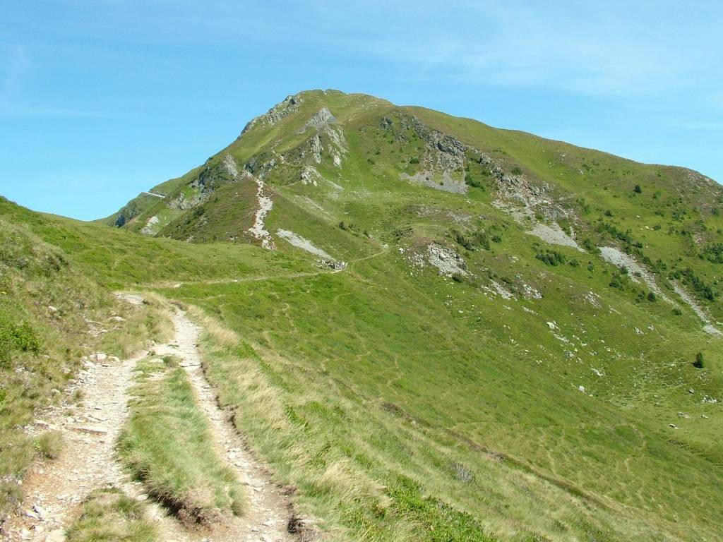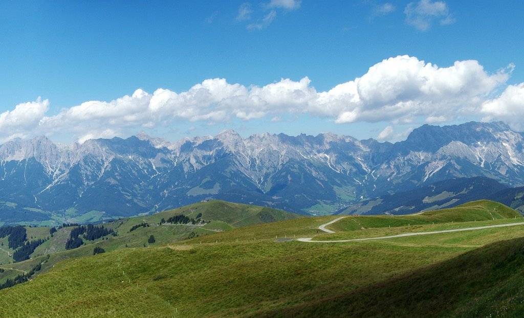 Po 3 kilometrach luzu robi się znów stromo, przekraczamy granicę lasu i po chwili widzimy już cel naszej wycieczki jak na dłoni. Trasa biegnie teraz południową stroną grani - widać stąd rozległe i dalekie panoramy. Na wysokości ok. 1950 m szuter się kończy, skręcamy w wąską rynnowatą ścieżkę. Pedałowanie staje się niemożliwe, ruszamy z buta i tak docieramy do wysokości około 2060 m, gdzie łączymy się z drogą z Maria Alm. Stąd już tylko parę minut kręcenia do schroniska Statzerhaus, które stoi dosłownie obok wierzchołka Hundsteinu.