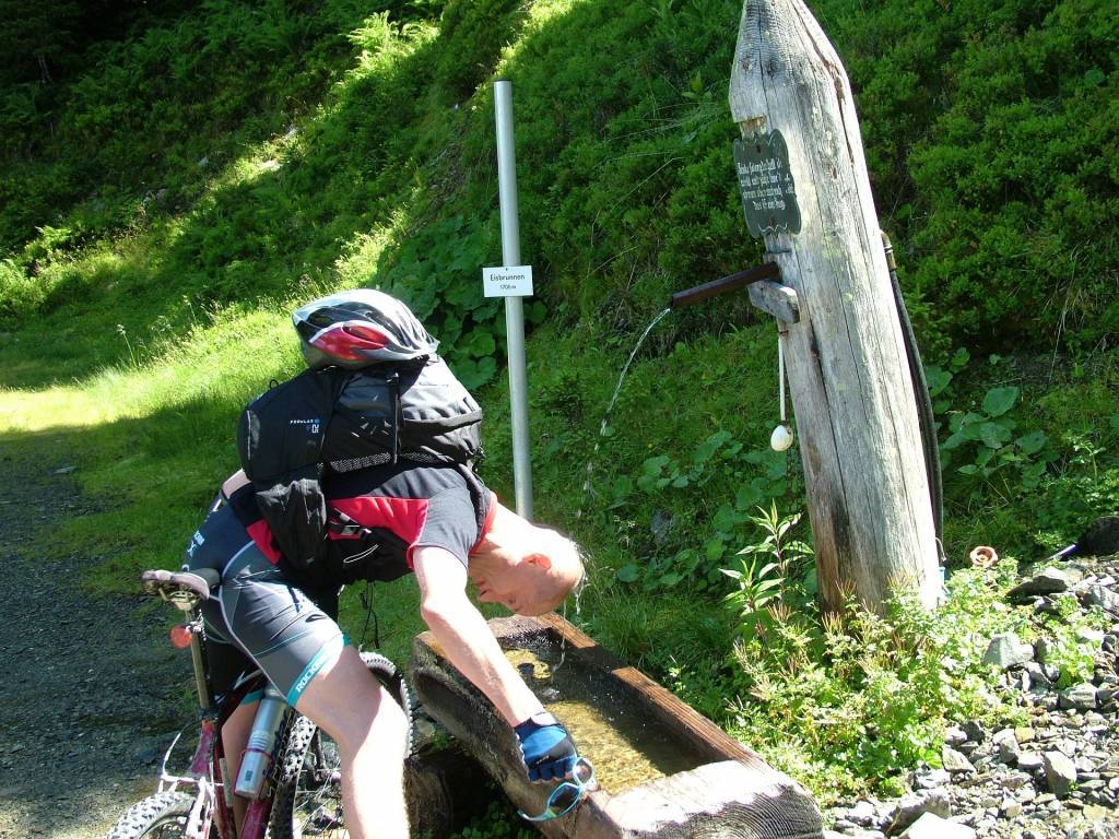 Po konsumpcji i uzupełnieniu płynów ustrojowych zaczynamy zjazd w kierunku Maria Alm am Steinernen Meer. Trasa szutrowa wiedzie serpentynami przez pastwiska, przekraczamy liczne bramki w ogrodzeniach (elektryczne pastuszki). Co 100-200 m w pionie zatrzymujemy się, żeby schłodzić obręcze (mamy v-breaki). Przy okazji podziwiamy masyw Berchtesgaden. Na trasie do Maria Alm jest dużo turystów pieszych, więc nie szalejemy. Końcówka zjazdu jest asfaltowa.