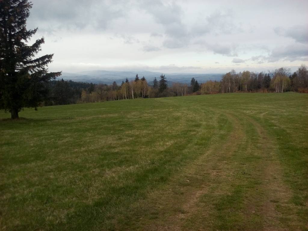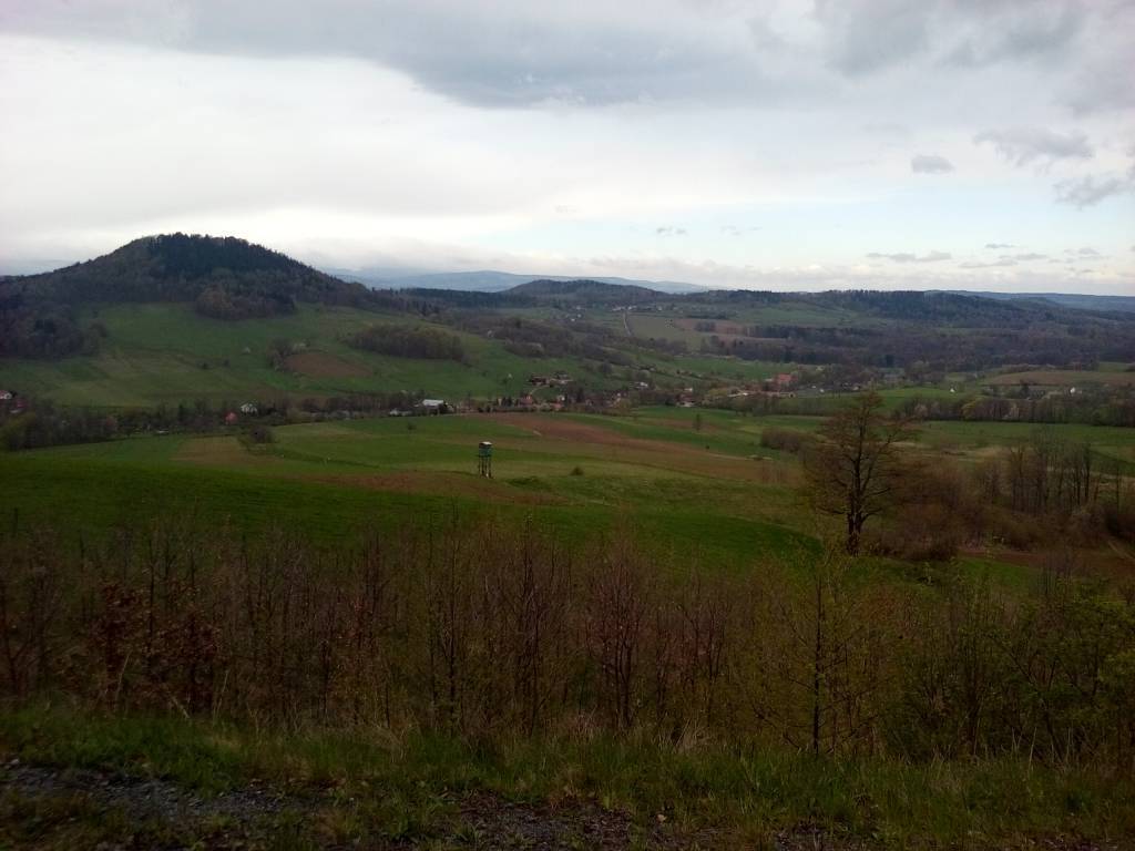 Możemy obserwować piękny widok na grzbiet małych Gór Kaczawskich Szybowisko, Stromiec i Skowron. Na drugim planie widzimy panoramę Karkonoszy, Gór i Pogórza Izerskiego. Niebieskim szlakiem kierujemy się w górę na Przełęcz. Przed Przełęczą opuszczamy niebieski szlak i idziemy ścieżką do średniowiecznego Grodziska (podgrodzie i gród właściwy), w którym mieści się punkt kontrolny (P1). Tą samą ścieżką wracamy do niebieskiego szlaku - do drogi. Szlak niebieski skręca w lewo do Chrośnicy, w tym momencie opuszczamy szlak i wracamy do polany pod Leśnicą https://pl.wikipedia.org/wiki/Le%C5%9Bnica_(Sudety_Zachodnie) i z powrotem drogą na Łysa Górę skąd możemy podziwiać urokliwy Masyw Okola.