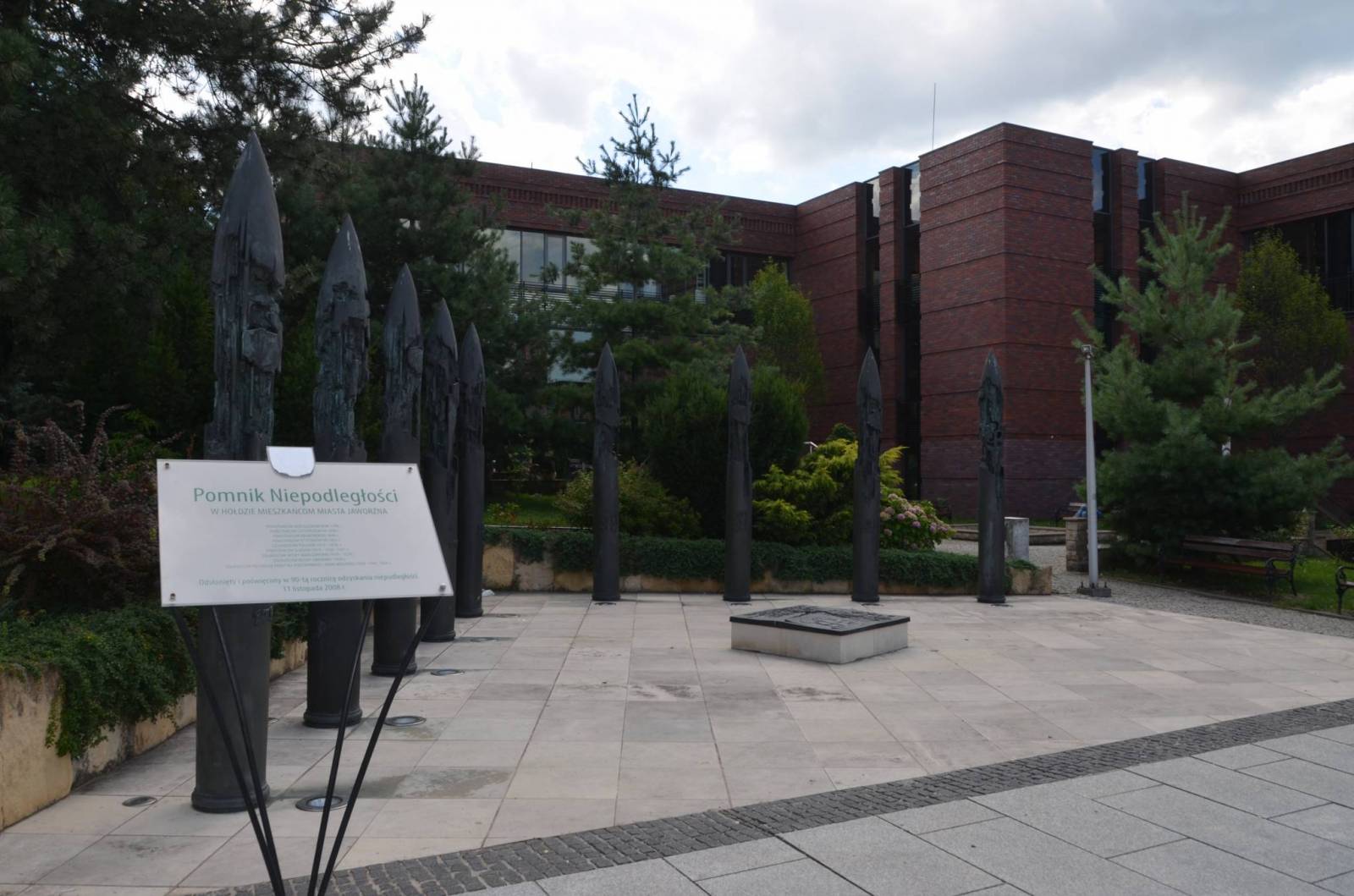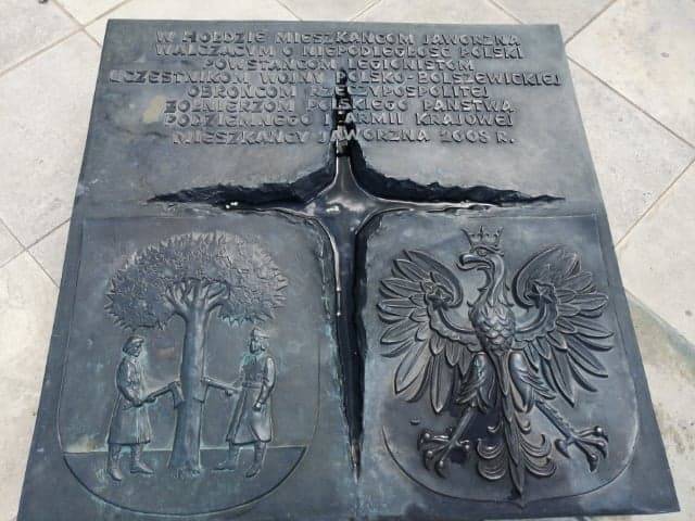 Na środku znajduje się kamienna płyta ozdobiona krzyżem, godłem Polski i herbem Jaworzna, w której umieszczono znicz. Płytę zdobi napis: