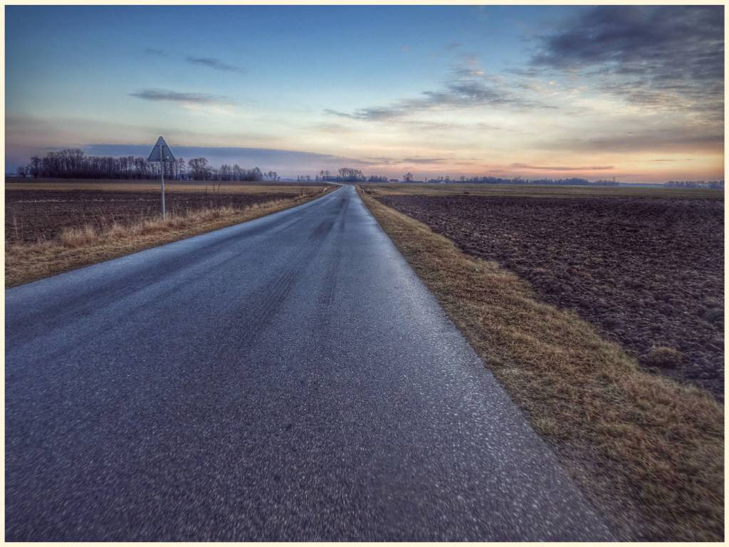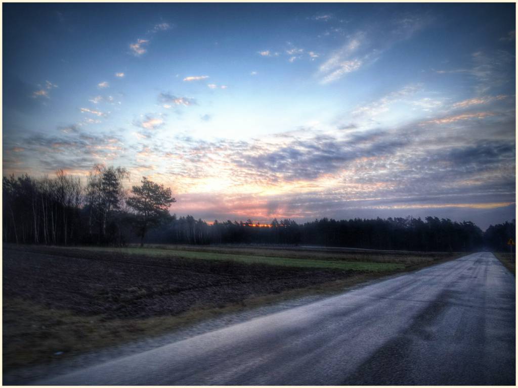 0C za oknem, piekne slonce na trasie, nic tylko jechac w stronee wschodzacego slonca. Pierwszy zakret i.....wiiuuuuuuuu. Szklanka...lod!!!