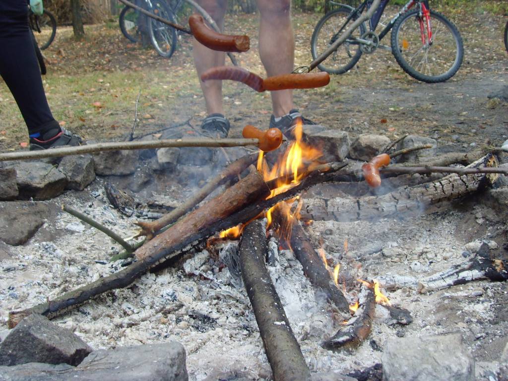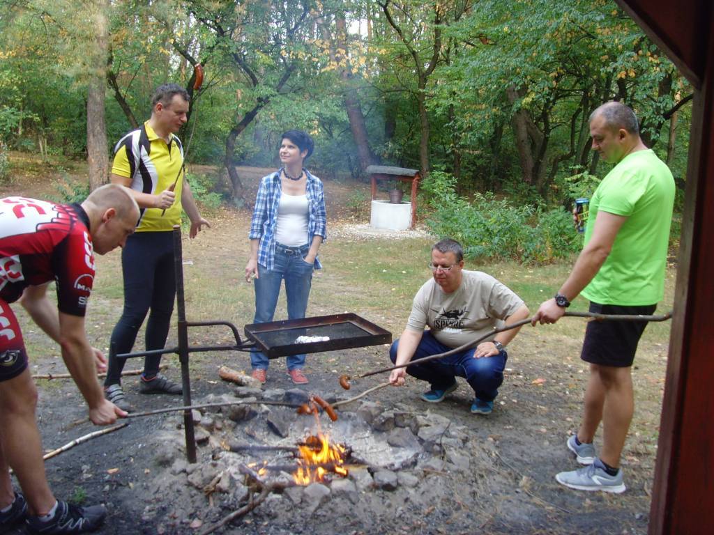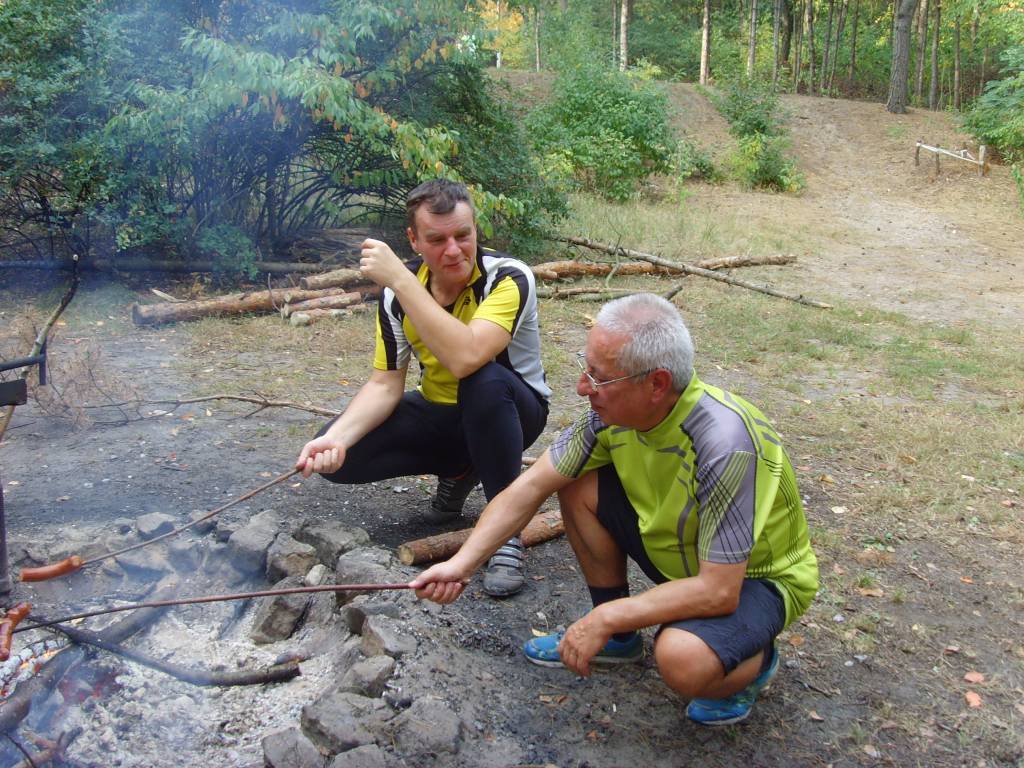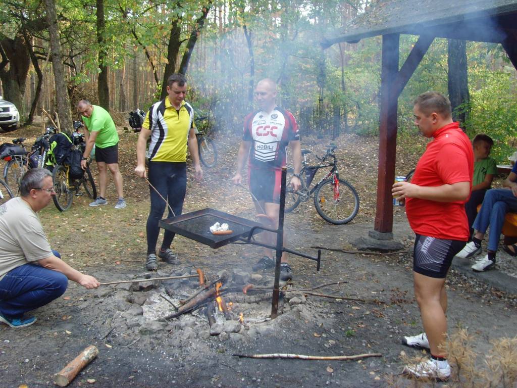 W drogę powrotną poprowadził nas Rysiek, który bardzo dobrze znał te okolice. Szosą dojechaliśmy do początku Dęblina, po czym skręciliśmy w lewo do stacji kolejowej. Przejechaliśmy przejazdem kolejowym i koło Fortu Mierzwiączka osiedlowymi uliczkami dotarliśmy do szosy Dęblin-Moszczanka. Skręciliśmy w pokrytą nowym asfaltem szosę do Bobrownik. Kiedy tam dojechaliśmy, w sklepie zaopatrzyliśmy się w prowiant na ognisko. Przez most nad Wieprzem, przez Niebrzegów dojechaliśmy w pobliże Łąk Bonowskich. Grupa rozbiła się na dwie części, z których pierwsza wybrała polną drogę na skróty, a druga pojechała w stronę Gołębia. Tylko Leon z tej drugiej grupy, drogą okrężną z pewnym opóźnieniem dojechał do Bonowa. Reszta, czyli Krys, Robert i Andrzej z Iloną pojechali od razu do Puław, bo mieli inne ważne zajęcia. I całe szczęście że Leon dotarł na ognisko, bo w swoich sakwach przewoził kilku osobom prowiant. Jego brak i niepewność co do ich losu w pierwszej chwili mocno zaniepokoiły niektórych, ale na szczęście skończyło się na kilku mocniejszych żołnierskich słowach, które ucichły natychmiast na widok Leona. Na miejscu piknikowym w Bonowie było już kilku nieznajomych, ale podzielili się oni z nami ogniskiem i miejscem przy stołach. Na miejsce dotarli też samochodem Ania, uczestniczka rajdów „Minimum Asfaltu” oraz Paweł, który zgubił nas na rowerze na początku tego rajdu. Przywieźli ze sobą trochę smakołyków, które były fajnym uzupełnieniem do pieczonych przez nas kiełbasek.