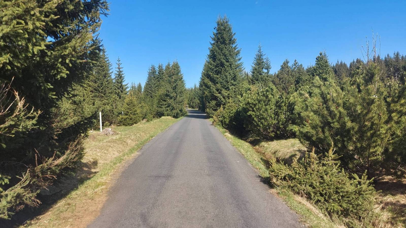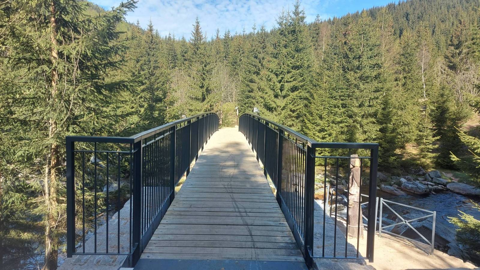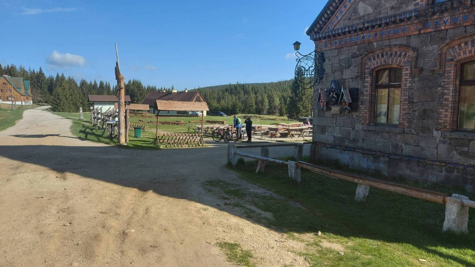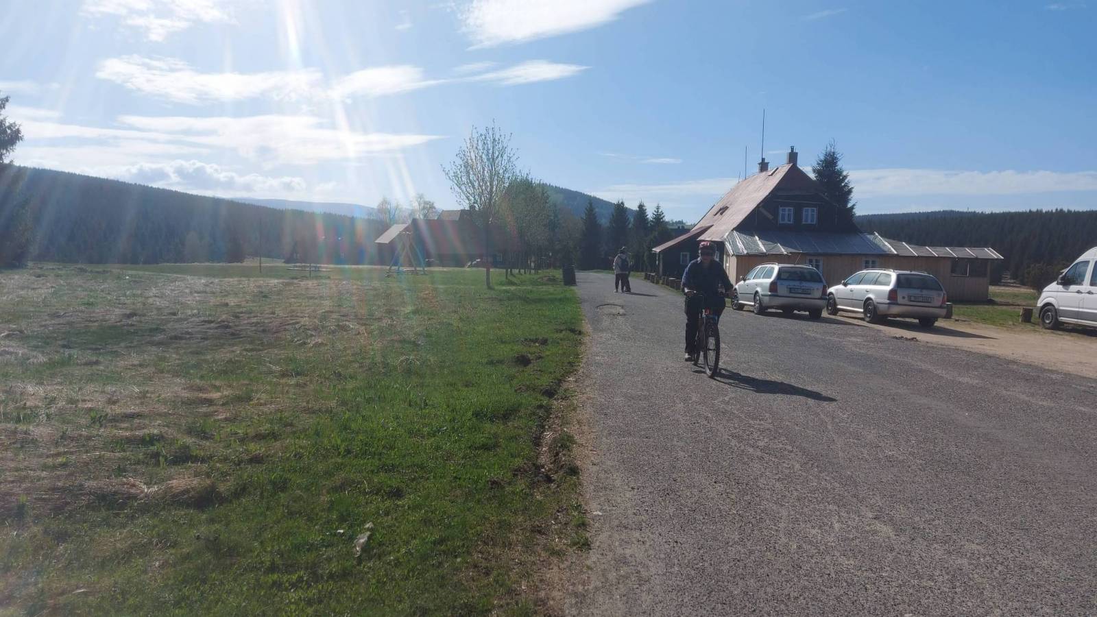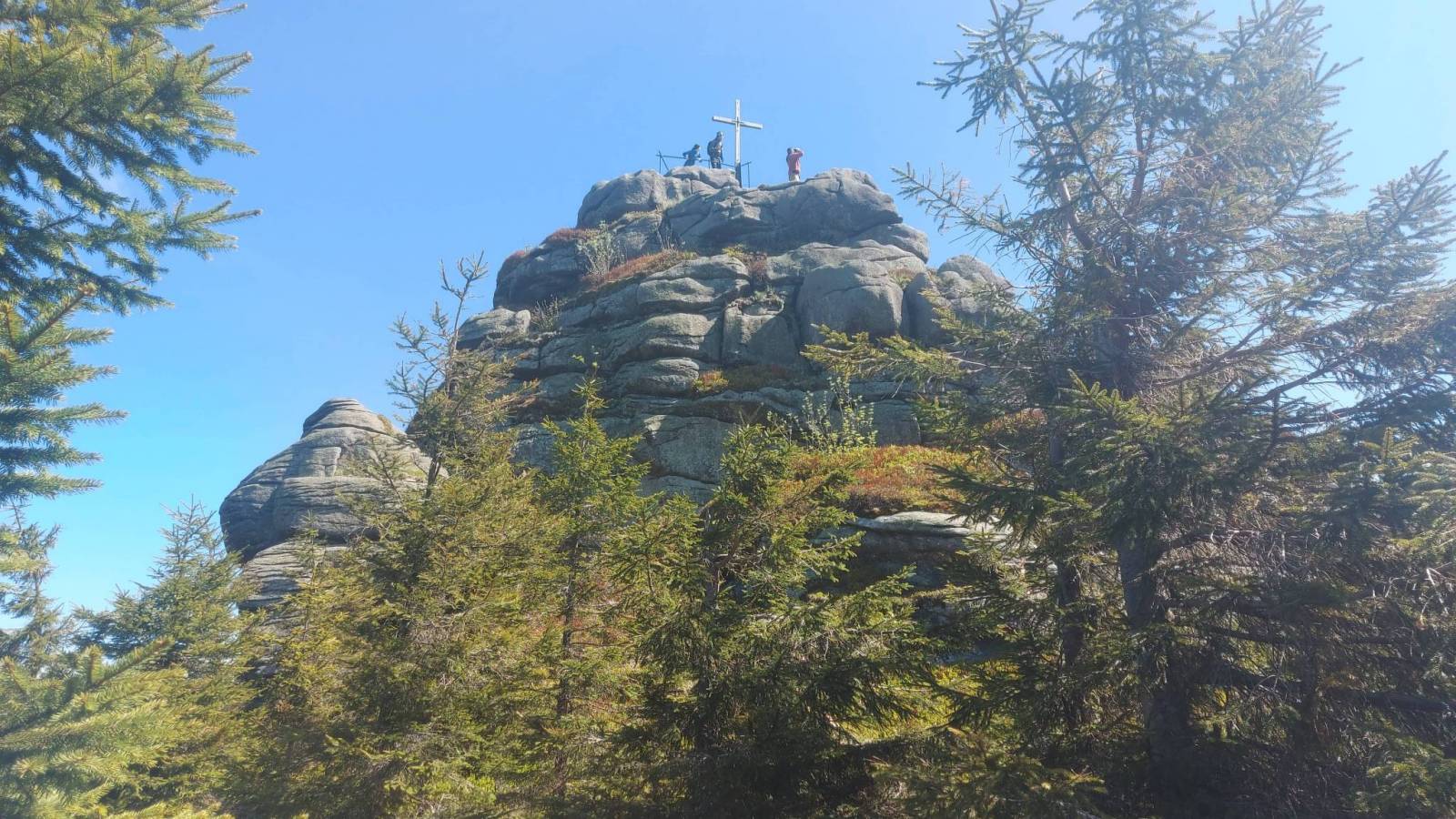 Drugi dzień pobytu w Górach Izerskich. Wycieczka rowerowo piesza na jeden z bardziej atrakcyjnych szczytów Jizerę. Do parkingu Smedawa dojechaliśmy na rowerach ze schroniska Orle prze Jizerkę. Trasa od osady cały czas asfaltowa z dłuższym odcinkiem podjazdu i dość stromym zjazdem na końcu, który niestety trzeba było pokonać w drodze powrotnej. Z parkingu na Jizerę wybraliśmy się pieszo. Odległość to około 6 km w dwie strony a zajęło nam to trochę ponad dwie godziny. Wierzchołek bardzo ciekawy z fantastycznymi skałami na które wchodzi się po powiedzmy sztucznych ułatwieniach w postaci drabin przymocowanych do skał. Widoki ze szczytu, który jest jednym z najwyższych w Izerach, rewelacyjne. Widać oprócz oczywiście samych gór Izerskich także Karkonosze, Jeszted, i pewnie jeszcze jakieś inne. Po powrocie znowu na rowerze powrót do schroniska Orle trochę zmienioną trasą z przejazdem Promenadni Cestą która z głównej drogi odchodzi w rejonie Kiosku u Joukla gdzie można zrobić przerwę i napić się na przykład piwa. Ostatni etap to powrót do Jakuszyc już z całym bagażem który rano został w przechowalni.