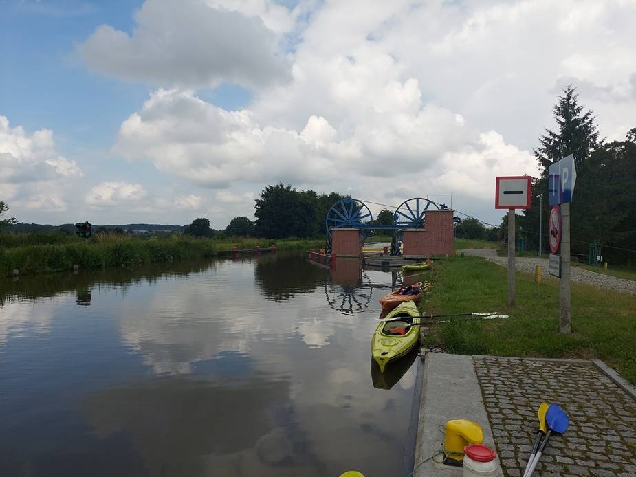 Wodujemy kajaki 1,5 km przed pierwszą pochylnią na prywatnym parkingu. Samochody można zaparkować, byle nie zastawiać przejazdu. Tam barki "Cyranka" i "Cyraneczka" rozpoczynają rejsy z turystami.