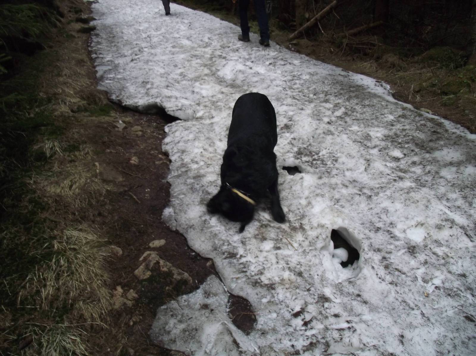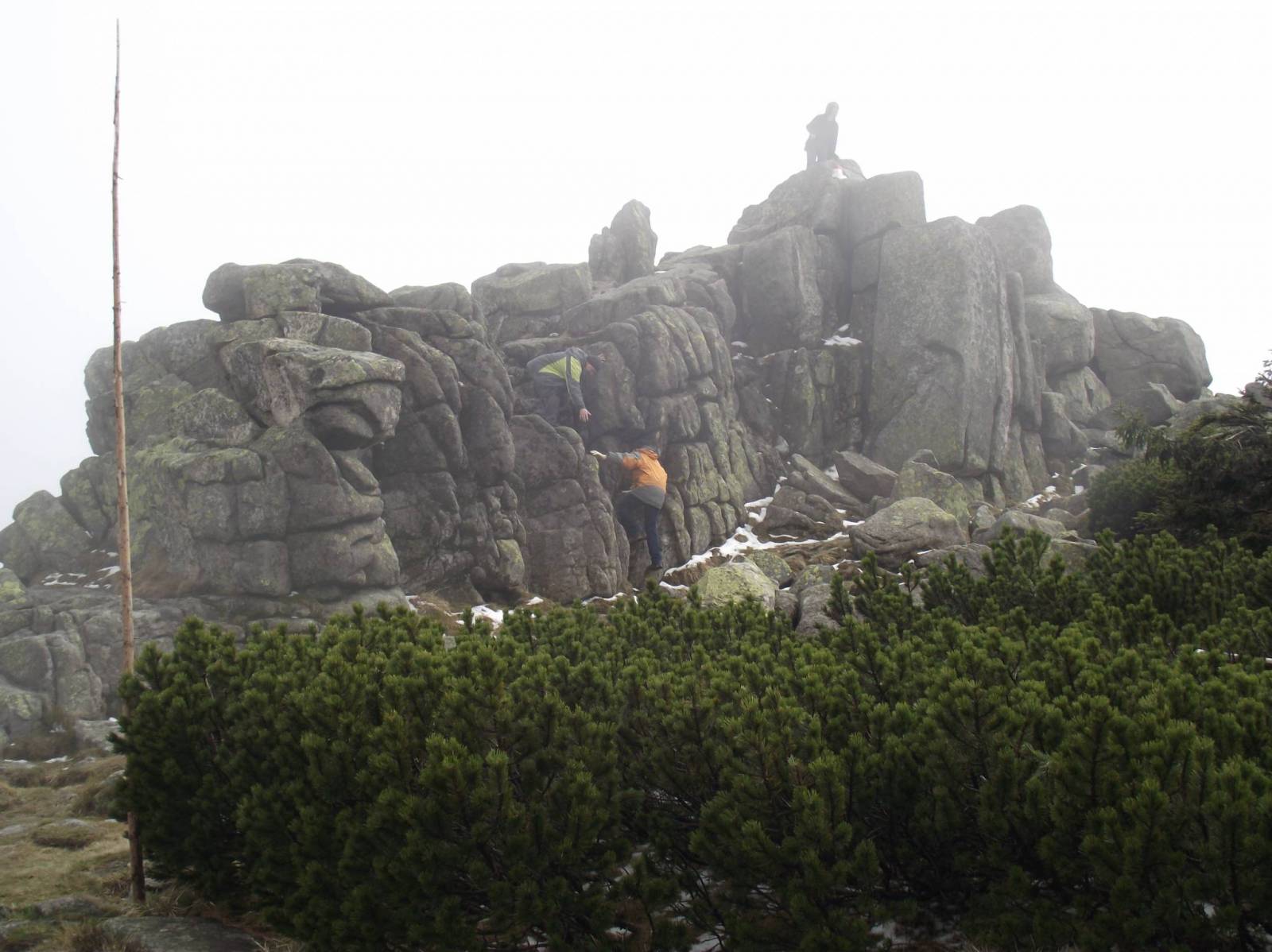 Rano pierwszego dnia piękna pogoda i bezchmurne niebo. Od godzin południowych pogoda zaczęła się pogarszać i na przełęczy Karkonoskiej zaczął padać deszcz, który z biegiem dnia przeszedł w deszcz ze śniegiem a potem śnieg. Gdy kładliśmy się spać w schronisku na Hali Szrenickiej padało już dość intensywnie ale temperatura była dość wysoka i śnieg topił się po opadnięciu na ziemię. Jakie było nasze zdziwienie na drugi dzień rano gdy zobaczyliśmy że przez noc spadło chyba 40 cm śniegu, dalej padało wiał silny wiatr a widoczność wynosiła może 5 metrów. Nie było szans na powrót do Spindlerovego Mlyna zaplanowaną trasą. Musieliśmy schodzić do Szklarskiej Poręby i bardzo mocno główkować jak dostać się na drugą stronę gór po auta. Operacja ta trwała około 6 godzin, cała Szklarska była zakorkowana a droga do Jakuszyc od strony Harahova zastawiona była tirami które daremnie próbowały podjechać na przełęcz.