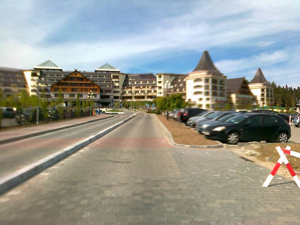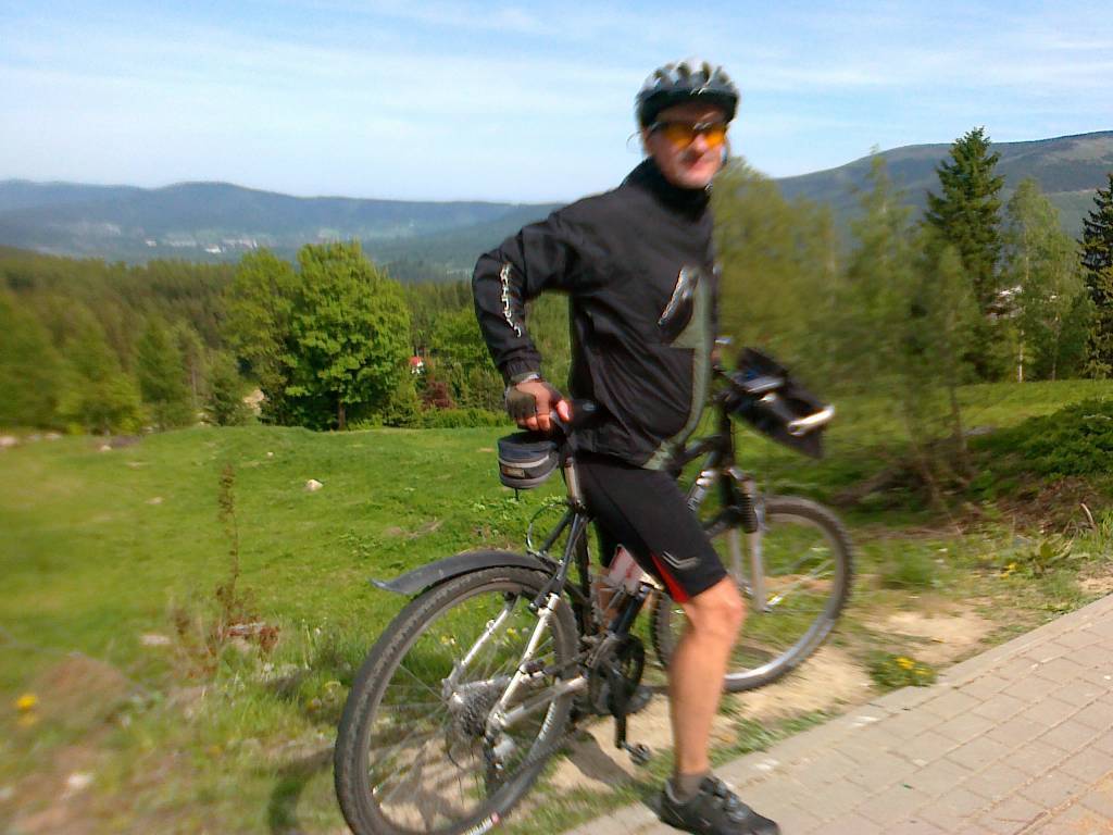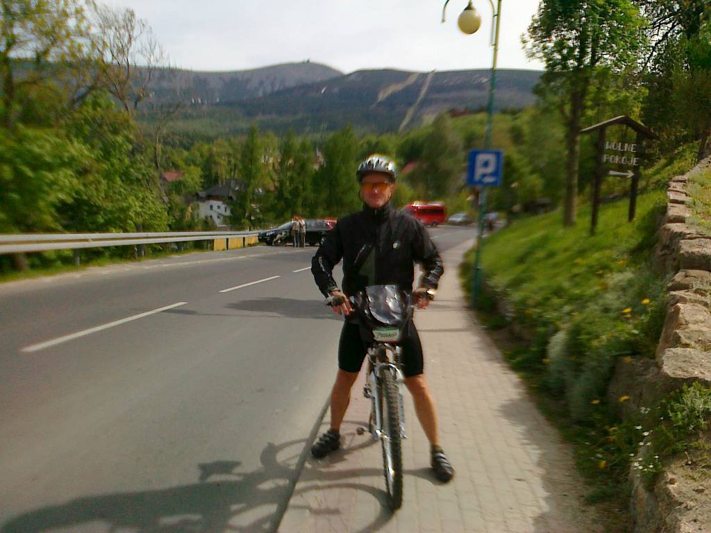 Popołudnie bez deszczu z dużymi przejaśnieniami ale dość chłodno. Z Podgórzyna ruszam w kierunku Sosnówki a następnie Borowic. Droga cały czas ostro pnie się pod górę. Na trasie piękne widoki na kotlinę jeleniogórską . Droga asfaltowa dośc dobrze utrzymana z niewielkim ruchem samochodowym . Po około 14 kilometrach dojeżdżam do Karpacza. Tutaj chwila przerwy i pora na nałożenie kurtki. W Karpaczu temperatura jest niższa o kilka stopni niż w kotlinie a dodatkowo teraz trasa prowadzi ostro w dół . Jadę powoli aby się nie wychłodzić , a przy okazji podziwiam piękną panoramę , Śnieżkę z charakterystycznymi „talerzami” oraz okoliczne szczyty.