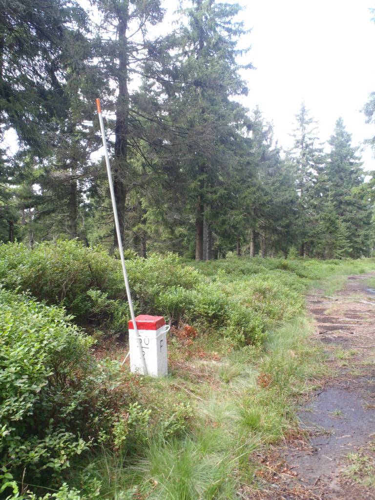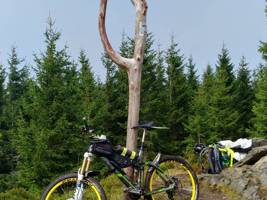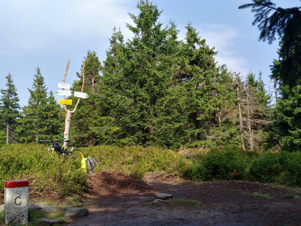 Dwójka czeskich cyborgów pojechała w lewo, tez trochę niepewnie. Ruszyłem za nimi. Okazało się, że mieli rację. Dukt doprowadził do rozwidlenia i szlaku, gdzie minąłem duuuużą grupę czeskich piechurów i ślizgając się na ulubionych korzonkach łagodym podjazdem wśrod drzew i jagodzin, bez większych już problemów w powoli przestającym padać deszczu znalazłem szczyt. Zrobiło się nawet słonecznie.