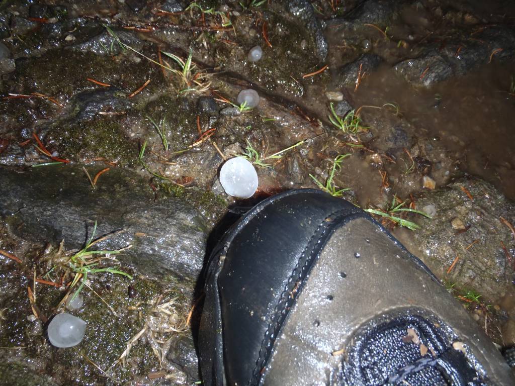 I możliwość pojechania dalej wzdłuż granicy. Grzbietowy, graniczny szlak, łagodnie w dół, dużo korzonków, trochę kamieni, miejscami przyjemne singileki. którymi dojeżdzamy do przełeczy i kiedyś graniczne budki w czeskim władaniu. Dobra pogoda nieubłaganie gdzies odchodziła, i to gdzieś było gdzie indziej niż ja. Kusił kierunek na Śnieżnik zielonym szlakiem, ale rozsadek wziął górę. Skierowałem się na rowerowy niebieski, później zielony w kierunku schroniska pod Śnieżnikiem. Dobra decyzja, bo po minięciu leśniczówki Kamienica, po prostu luneło. Byłem przygotoway, Folia od góry do dołu, mogło sobie padać. Mozolnie piałem się w góre. Mogło padać napisałem, ale grad wielkości przepiórczych jajek to nie opad tylko bombardowanie. Dzwięków jakie wydawały gradowe kulki uderzajace w kask nie powstydziły by się najlepsze strzelaninowe filmy. A tylko głowa i plecy były chronione, wiec biczowanie gradem zostało zapamiętane.