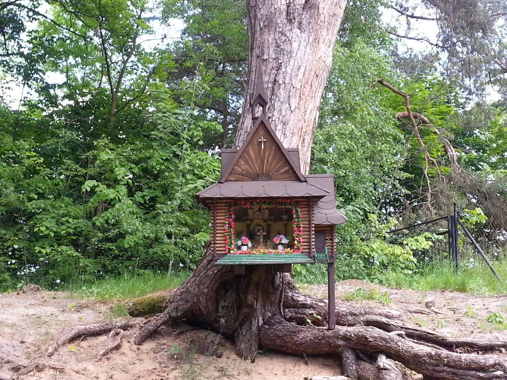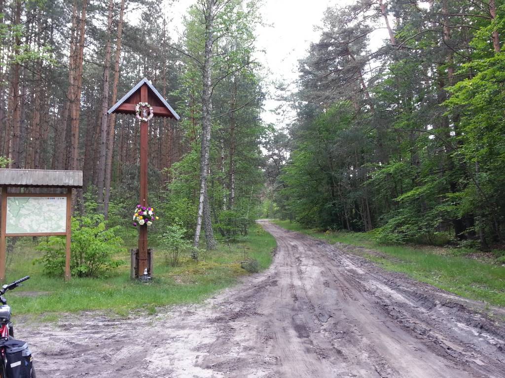 Fajna malownicza trasa rowerowa średnio trudna z powodu konieczności jazdy okresowo po piaszczystych jakże charakterystycznych dla Roztocza drogach między polami lub przez lasy . Naszą wyprawę rozpoczynamy przy pięknej starej kapliczce na wodzie w Krasnobrodzie Podklasztorze stąd jedziemy drogą asfaltową w kierunku Majdanu Wielkiego i Majdanu Małego. Mijamy malowniczo położone przy drodze obie miejscowości . W Majdanie Małym pięknie położonej – „zagubionej na końcu świata „ miejscowości droga asfaltowa kończy się przy sklepie GS i rozwidla się na dwie drogi gruntowe, my skręcamy w lewo na drogę gruntowa i jedziemy w kierunku lasu . Następnie drogą gruntowo – piaszczystą jedziemy chwilkę przez las i wyjeżdżamy z lasu na malownicze pola . Można podziwiać malownicze łąki, otacza nas cisza i słychać tylko szum traw i śpiewy ptaków, wokół nie widać już śladów człowieka -czuć samotność . Jadąc patrzmy na drogę na której możemy zobaczyć wygrzewające się w słońcu węże. Jedziemy dalej drogą gruntową przez pola kierując się na widoczną w oddali ścianę lasu, dojeżdżamy do niego i tak jak prowadzi droga gruntowa jedziemy przez las dojeżdżając do drogi asfaltowej Krasnobród – Tomaszów Lubelski tutaj skręcamy w prawo w kierunku Krasnobrodu i drogą asfaltową jedziemy ok. 1- 1,5 km dojeżdżając do leśniczówki Figarnia tutaj z asfaltu skręcamy w lewo i po przejechaniu ok. 200m skręcamy w leśną drogę gruntową w prawo wjeżdżając w piękny stary ciemny iglasty las przez który jedziemy utwardzoną gruntową drogą. Otacza nas leśna cisza , słychać tylko śpiew ptaków i szum starego ciemnego lasu , czuć aurę tajemniczości starego drzewostanu . Dojeżdżamy do skrzyżowania dróg leśnych na których pojawia się idący od prawej szlak pieszy i my skręcamy właśnie w prawo w piaszczystą drogę leśną idącą pod górę. Tutaj trudno się jedzie więc podprowadzamy rower na górę , na górze wyjeżdżamy z lasy na skraj malowniczo położonej w środku lasu małej wsi Szur. Jedziemy piaszczystą drogą przez wieś podziwiając stare drewniane zabudowania charakterystyczne dla Roztocza, na środku wsi mijamy ogromne stare drzewo na którym wisi piękna drewniana bogato rzeźbiona kapliczka. Jadąc dalej dojeżdżamy do położonej na skraju wsi malowniczej i tajemniczej galerii strachów na wróble. Po oglądnięciu poprzyczepianych do płotów strachów opuszczamy wieś Szur drogą gruntową , która znowu prowadzi nas przez malowniczy las w którym słychać tylko szumiący las i śpiewające ptaki. Jedziemy drogą do Krasnobrodu. Po kilku kilometrach dojeżdżamy do rozwidlenia dróg na którym żegna nas piękna przydrożna kapliczka w kształcie krzyża oraz przyczepiony do drzewa strach na wróble, my skręcamy w prawo i jedziemy dalej, dojeżdżamy do Krasnobrodu, droga gruntowa przechodzi asfalt i po przejechaniu ok. 0,5 km asfaltem skręcamy w lewo w ulicę Modżewiową, która wiedzie nas przez las do asfaltowej drogi na której skręcamy w prawo w kierunku Krasnobrodu , po wjechaniu na małą górkę jesteśmy już w Krasnobrodzie , jedziemy dalej tak jak prowadzi droga asfaltowa i po chwili widzimy drogowskaz w lewo w kierunku na zalew, jedziemy w tę stronę i dojeżdżamy do zalewu wokół którego prowadzi ścieżka pieszo – rowerowa . Po przeciwnej stronie zalewu na wzniesieniu widzimy wieże widokową do której się kierujemy. Po dojechaniu na parking pod wieżą kończy się nasza wycieczka , możemy teraz wejść na wieżę widokową i podziwiać piękną panoramę na malownicze tereny Roztocza i położony w dole Krasnobród.