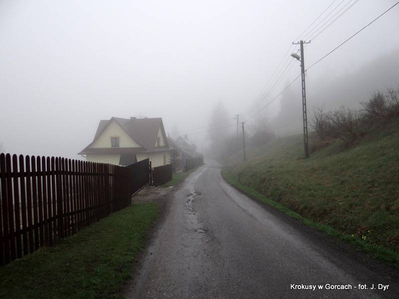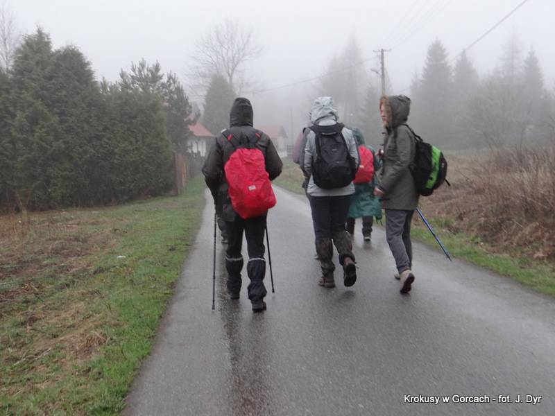 Tydzień wcześniej inna ekipa Aktywnych+ miała słoneczną pogodę, a my mamy krajobraz zasnuty mgłą ... raz cieńszą jej woalką, raz grubszą. Jest też dużo chłodniej niż tydzień temu więc krokusy tulą swe łebki i nie pokazują kolorowego wnętrza kielichów. Do tego ciepło minionego tygodnia roztopiło śnieg i lód zalegający w wyższych partiach stoków i teraz pod nogami mamy tego skutki ... gliniana breja atakuje bezlitośnie nasze buty i ubrania.