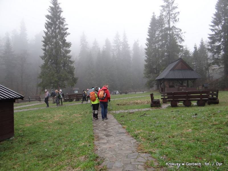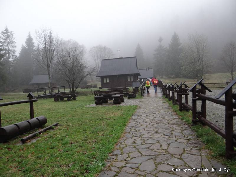 A teraz pora w drogę. Świat przesłania mgła, siąpi drobny kapuśniaczek. Dzisiaj najwyższym punktem wędrówki jest schronisko PTTK pod Turbaczem. Część osób i tak wejdzie jednak wyżej, bowiem przespaceruje się dodatkowo na Turbacz, który jest dopiero jutro w programie.