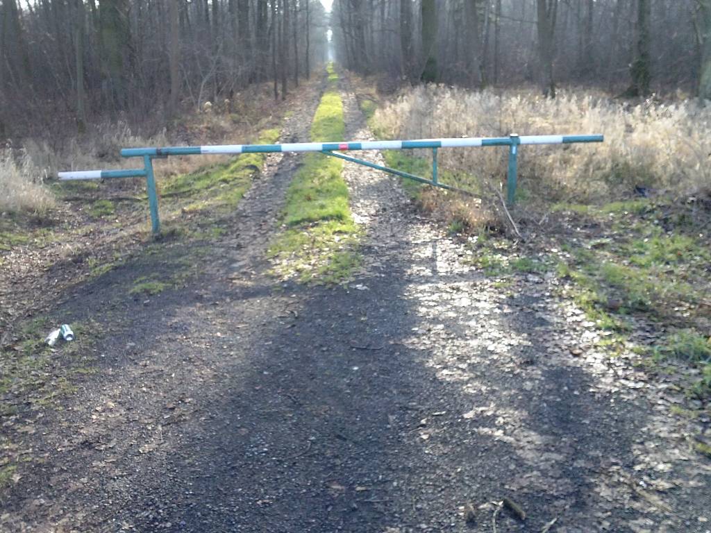 Wchodzimy do lasu przy słupku drogowym 102/9 przy szlabanie.