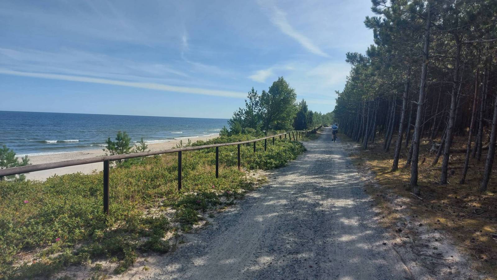 Rowerowa trasa R10 na odcinku od Kątów Rybackich do granicy z Rosją. Przerwa przy wejściu na plaże nr 1 blisko granicy. dalej przejście już zabronione a teren odgrodzony płotem. Był to pierwszy dzień naszego urlopu zakończony noclegiem na polu namiotowym w Kątach Rybackich. Przy okazji mieliśmy okazję zobaczyć przekop Mierzei. Prace są na ostatnim etapie więc za niedługo przeprawa zostanie otwarta. Wykąpaliśmy się też w morzu w najbardziej na wschód wysuniętym punkcie polskiego wybrzeża. Sama ścieżka poprowadzona w większości lasem bez widoków. Jedynie fragment z folderów reklamowych biegnący wzdłuż plaży przed Krynicą Morską jest bardzo atrakcyjny widokowo. Przy przekopie są na sąsiadujących z nim pagórkach punkty widokowe z których widać zarówno kanał jak i morze i zalew. Największą wadą całej trasy i mierzei jest ogromna ilość komarów które skutecznie uprzykrzają życie wczasowiczom.